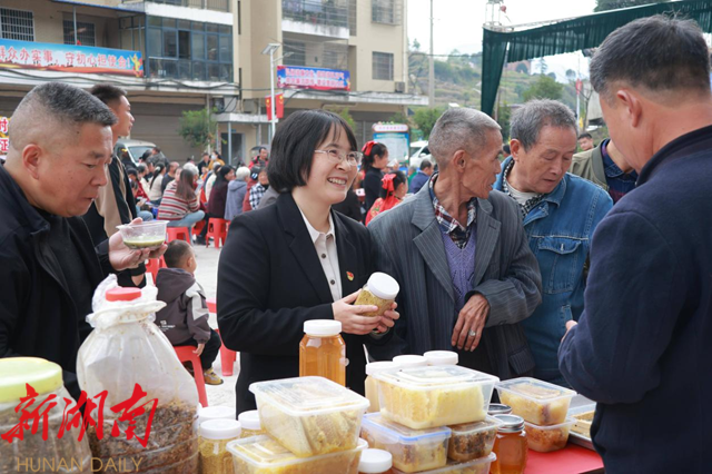 在文明集市板块,犹南山村的茶叶、万龙村的红薯粉、蜂蜜、擂茶等土特产供社区居民免费品尝,自愿选购。