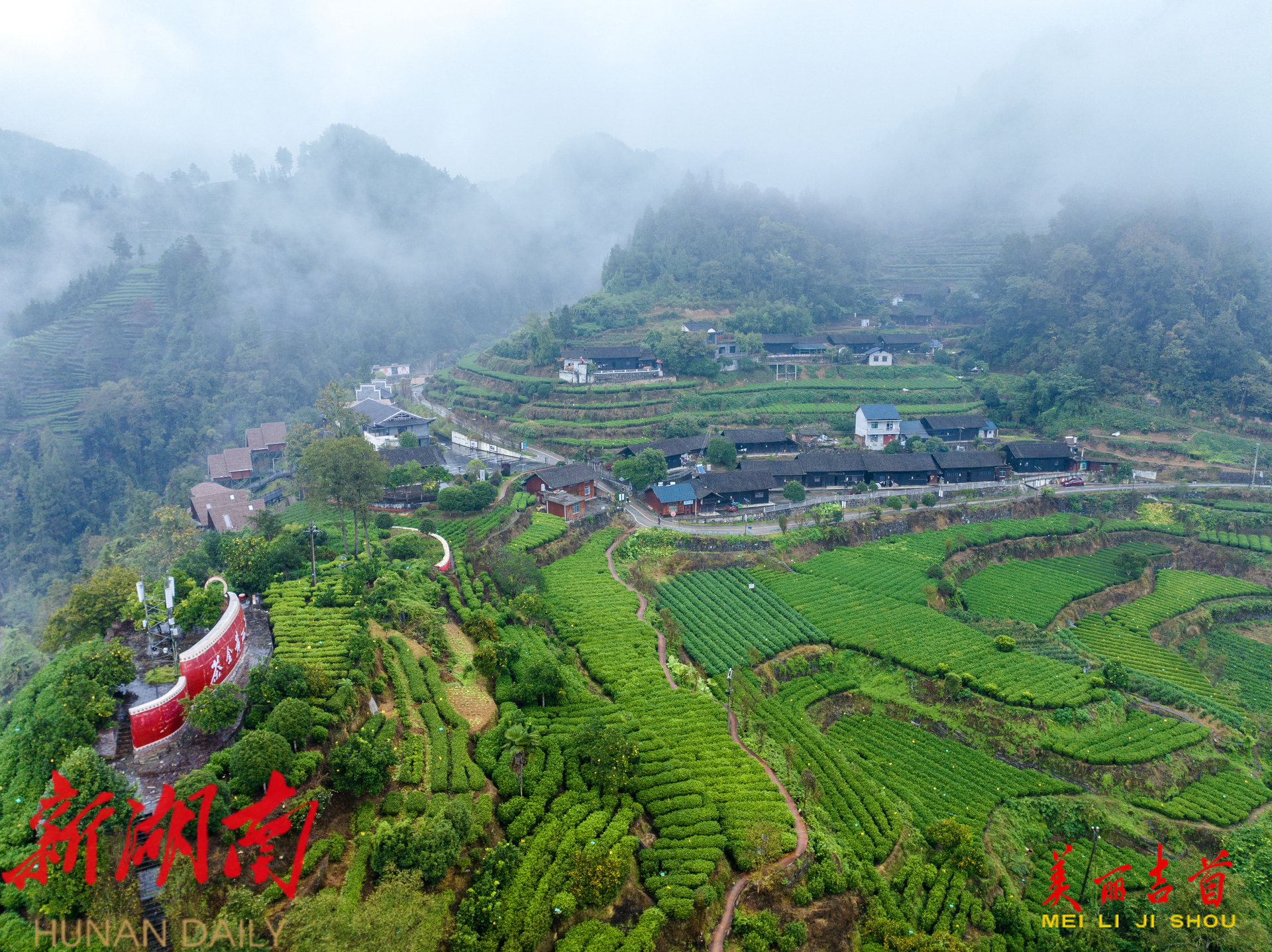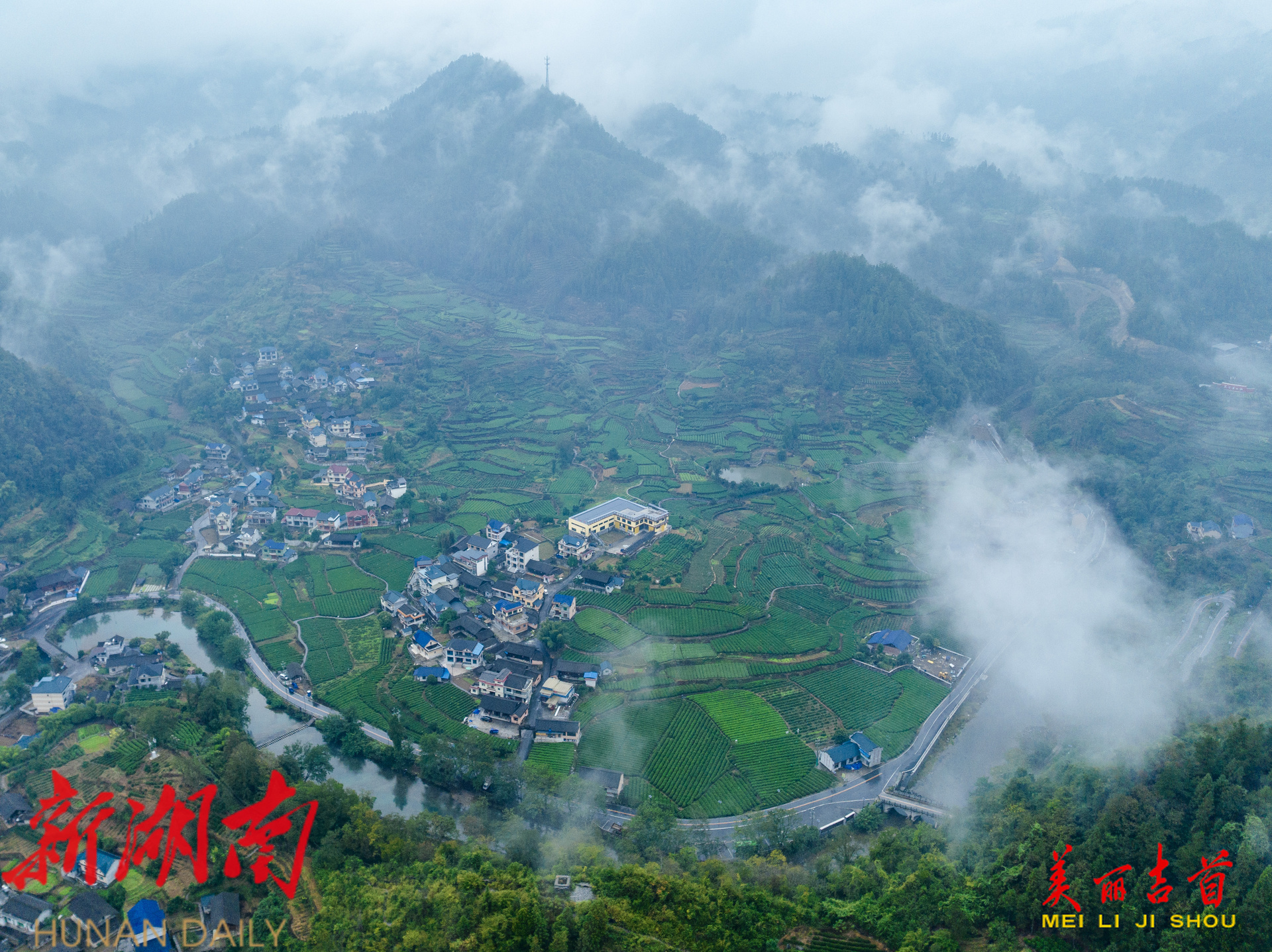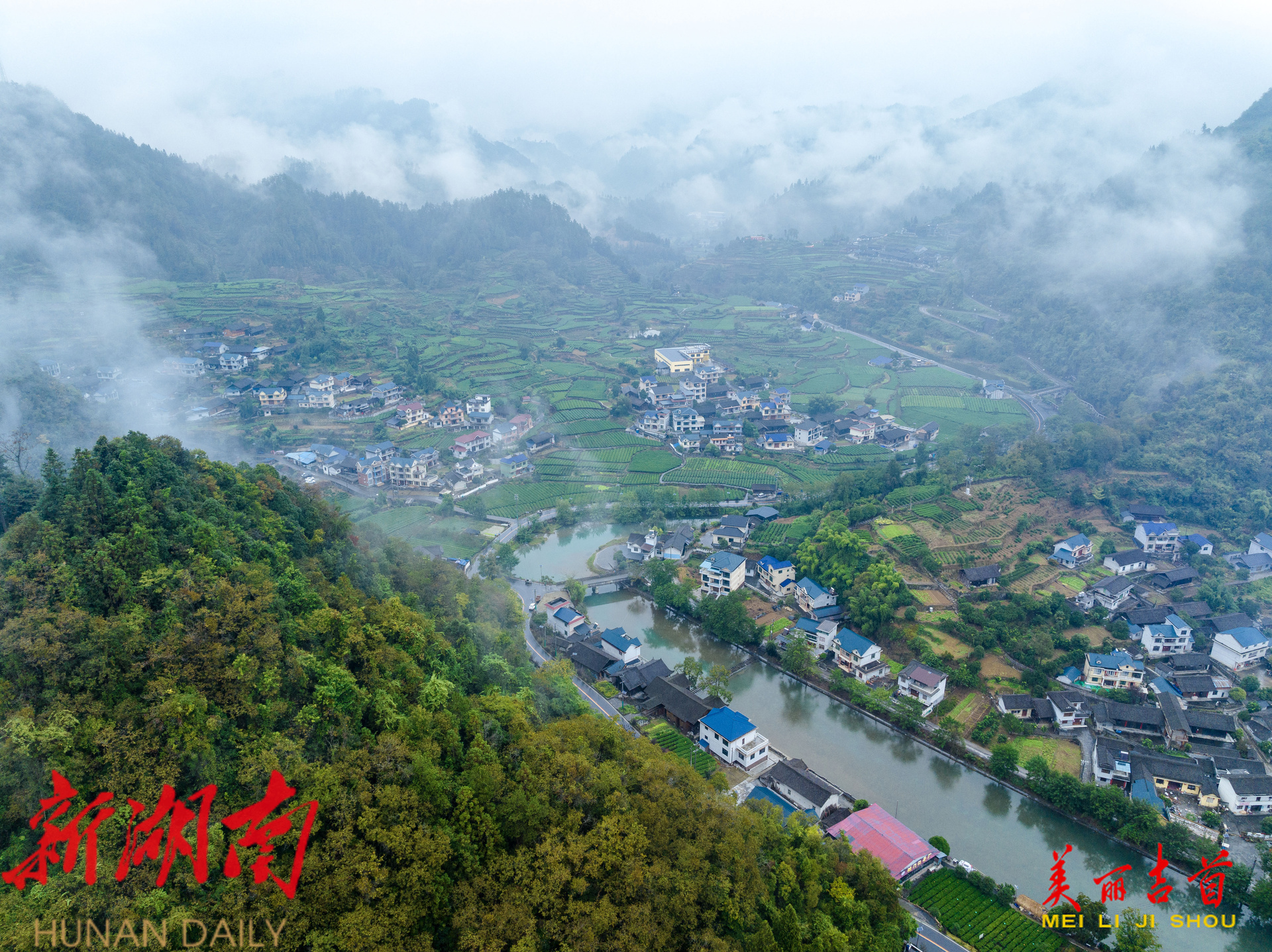 吉首市融媒体中心10月30日讯(全媒体记者 彭璟)2025年10月30日,吉首市马颈坳镇隘口村秋雨朦胧,茶园、村庄、河流与青山在雨雾中共同勾勒出一幅绿色生态与和美家园的画卷。