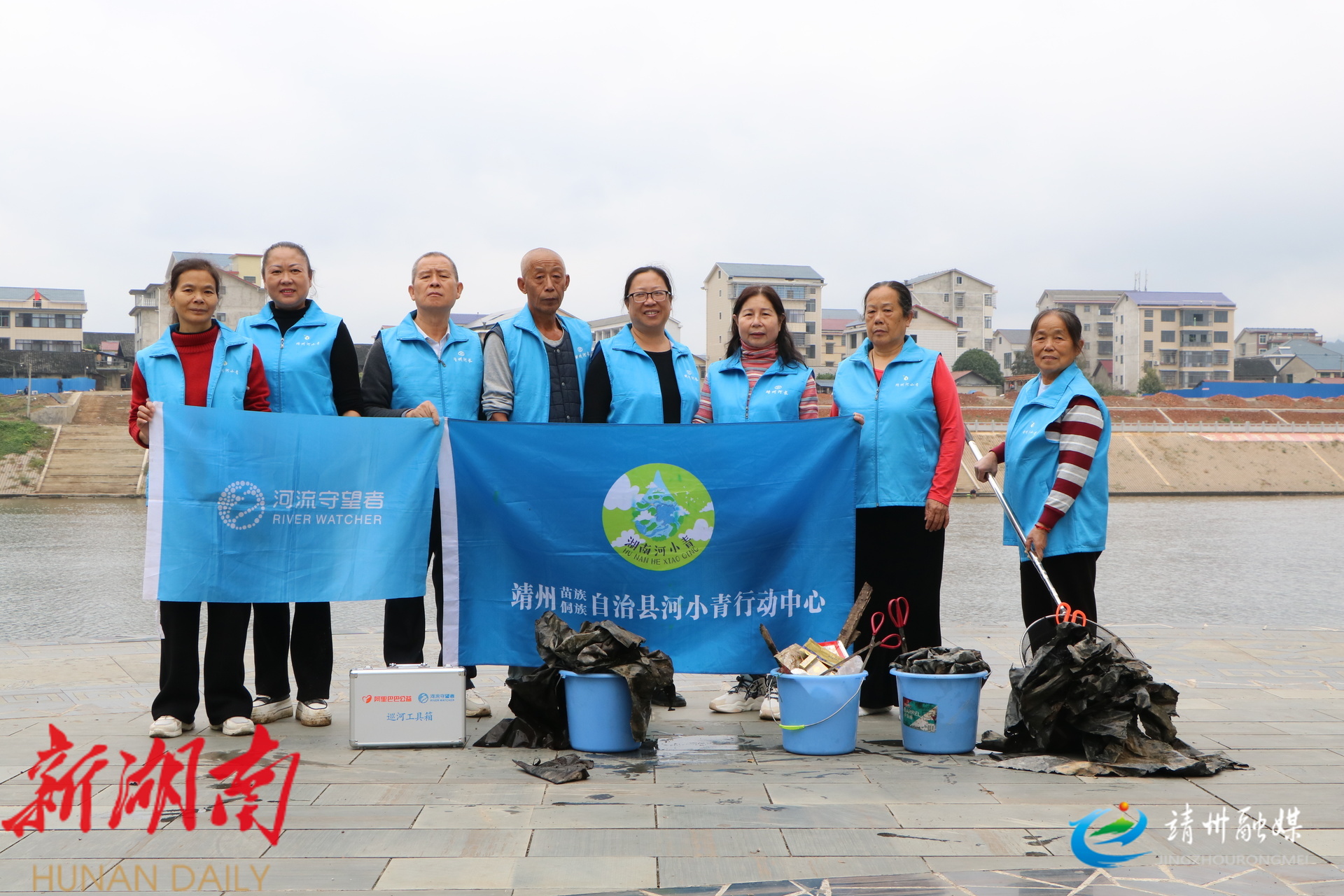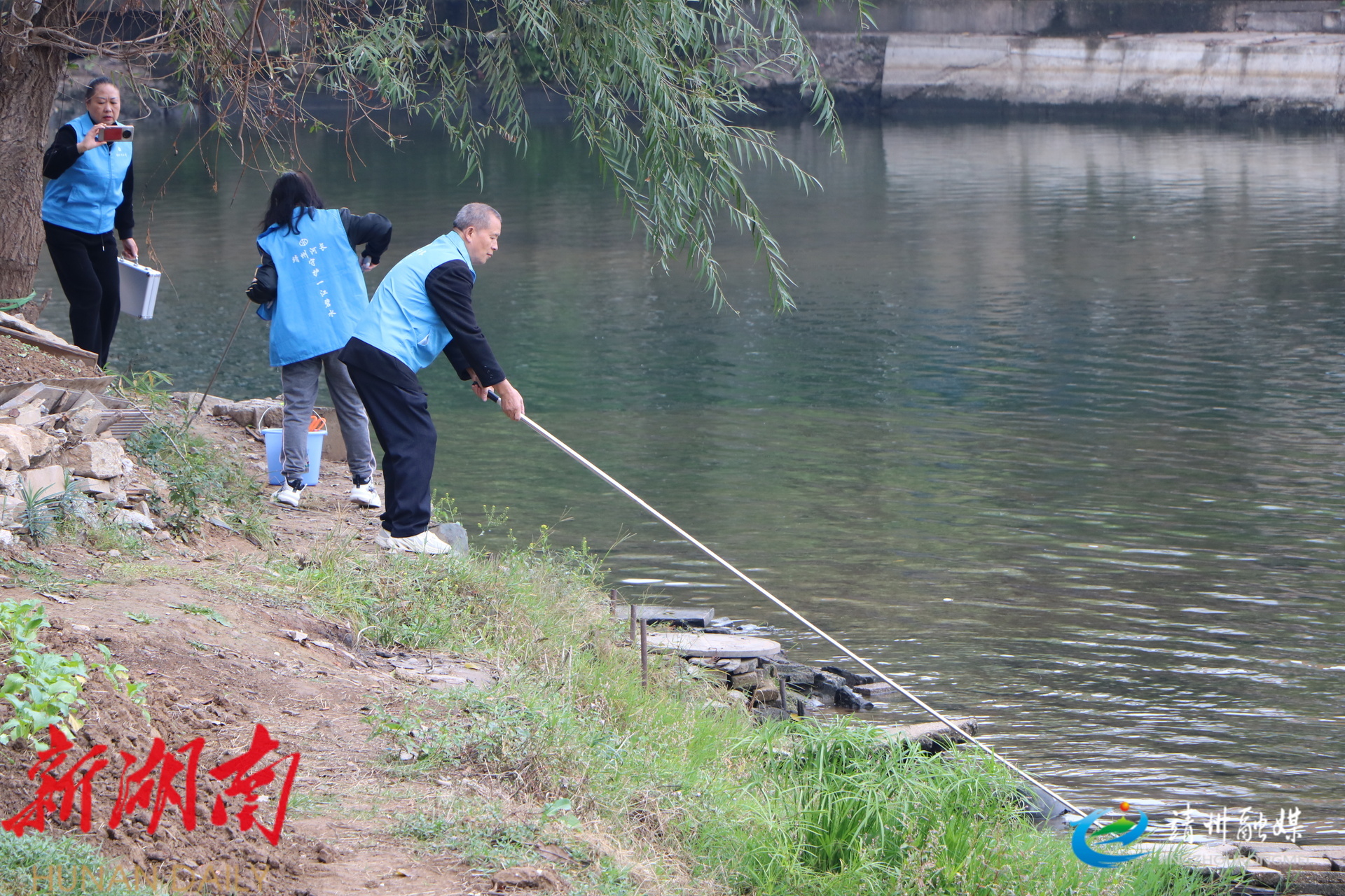 志愿者手持工具沿河道清理塑料瓶、包装袋等废弃物,以实际行动守护母亲河。