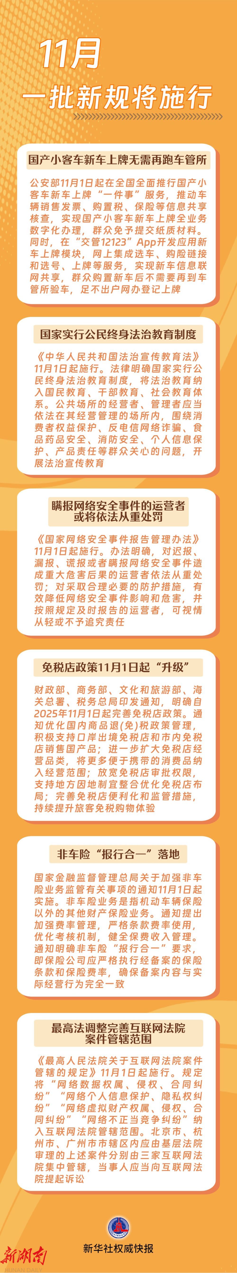 无需再跑车管所,国产小客车新车上牌全业务数字化办理;明确国家实行公民终身法治教育制度;对瞒报网络安全事件造成重大危害后果的运营者依法从重处罚……11月起施行的这些新规,一起来看!