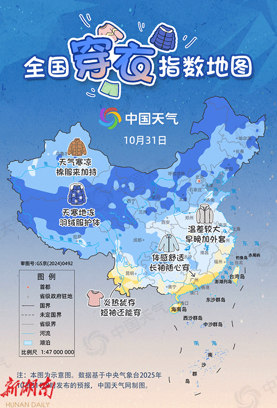 河南、湖北、江苏、安徽、浙江、上海、江西、湖南等地体感总体比较舒适,长衣长裤可随心搭配,但部分地区昼夜温差较大,早晚出门需添件外套。华南大部最高气温在25℃以上,海南等地炎热犹存,可穿短袖或长袖。