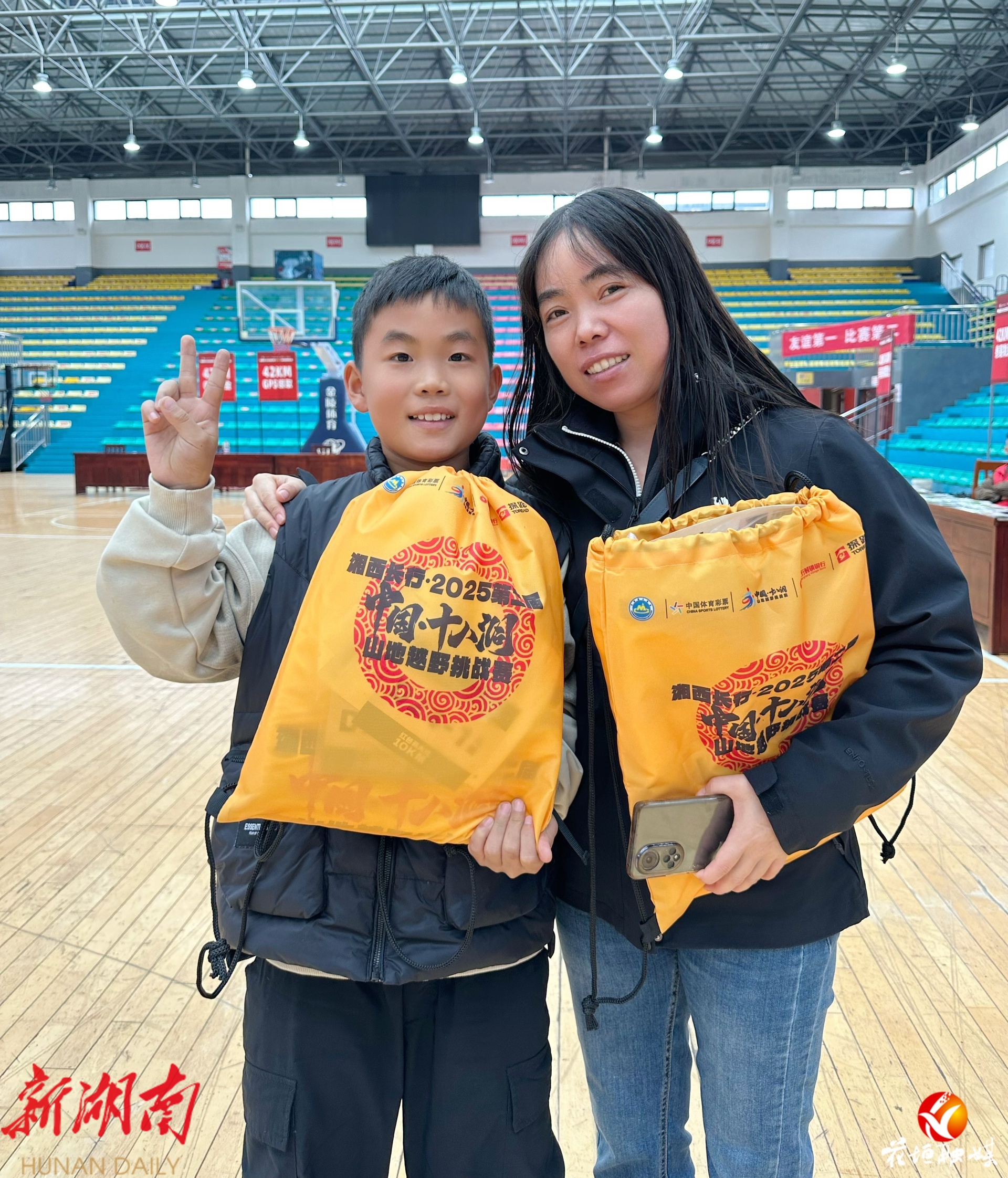 小选手彭意阳与自己的妈妈领取好了参赛物资