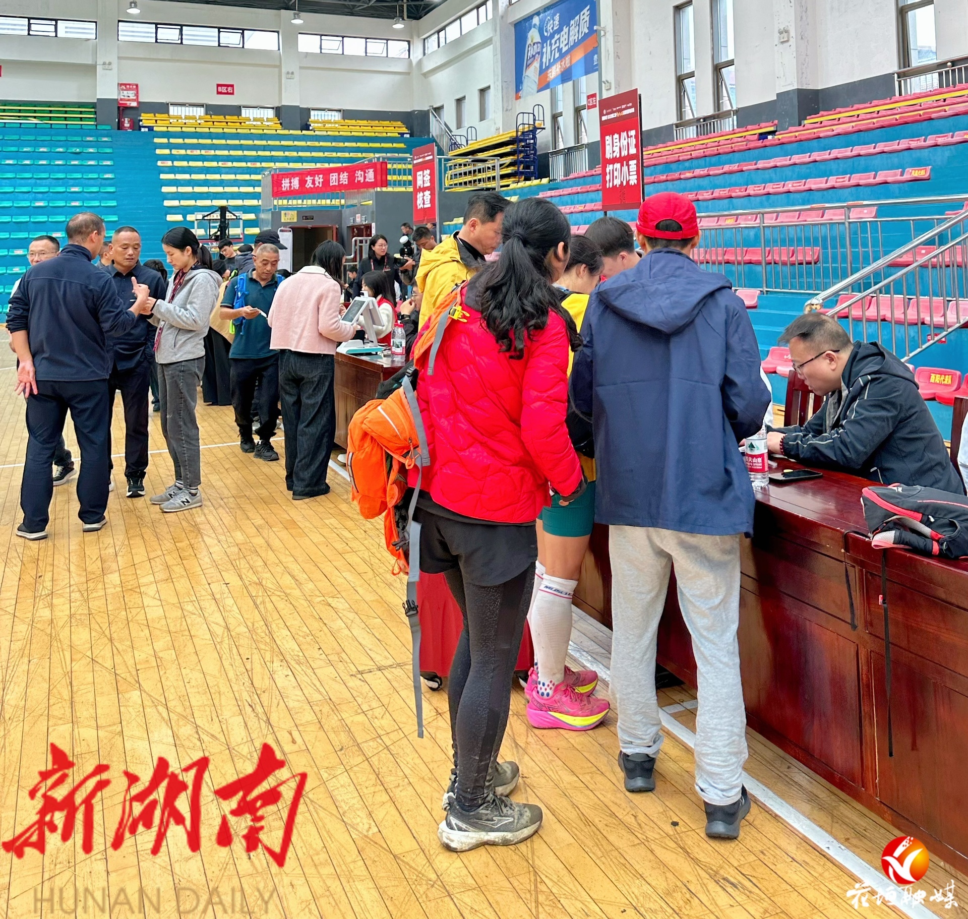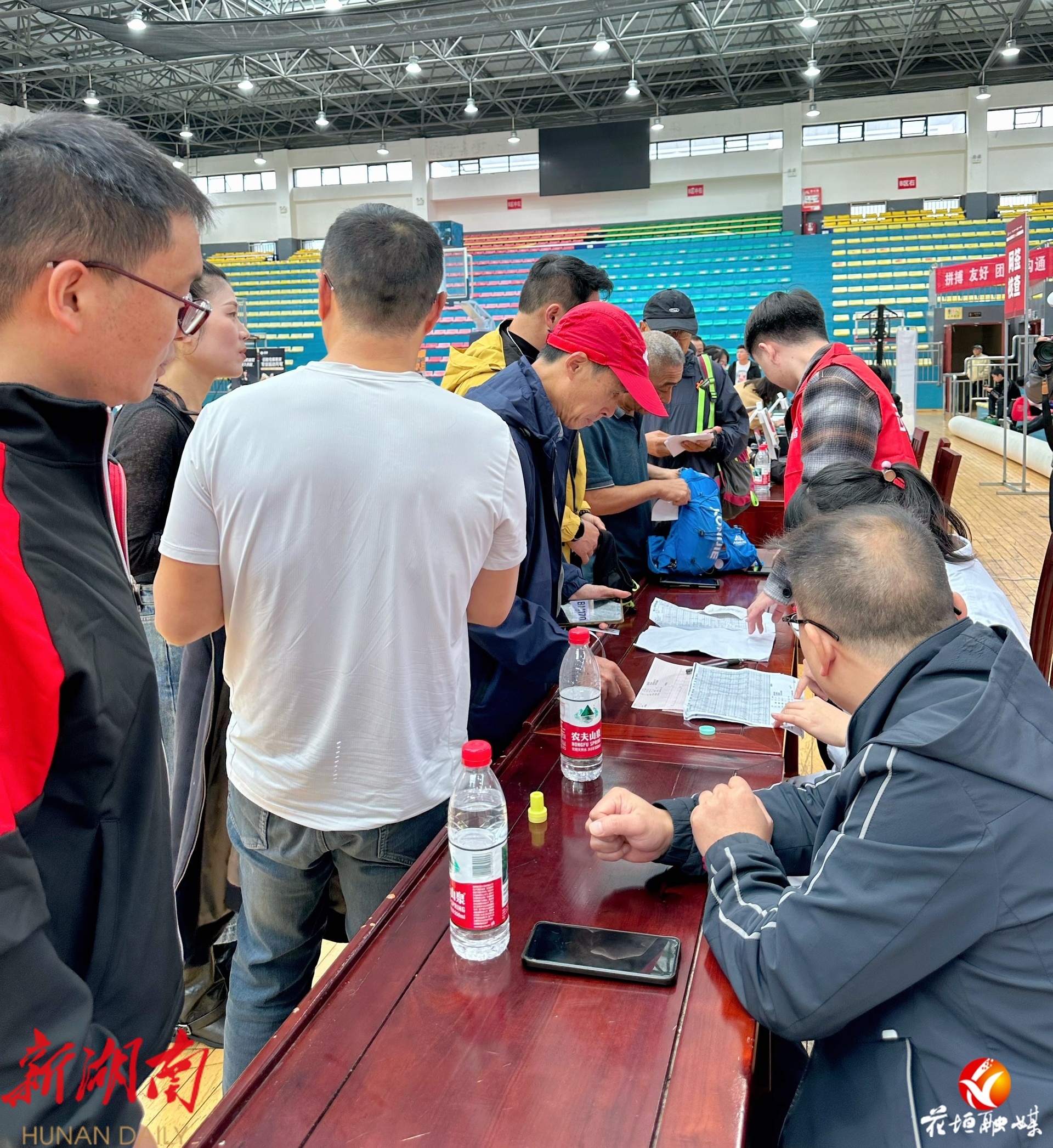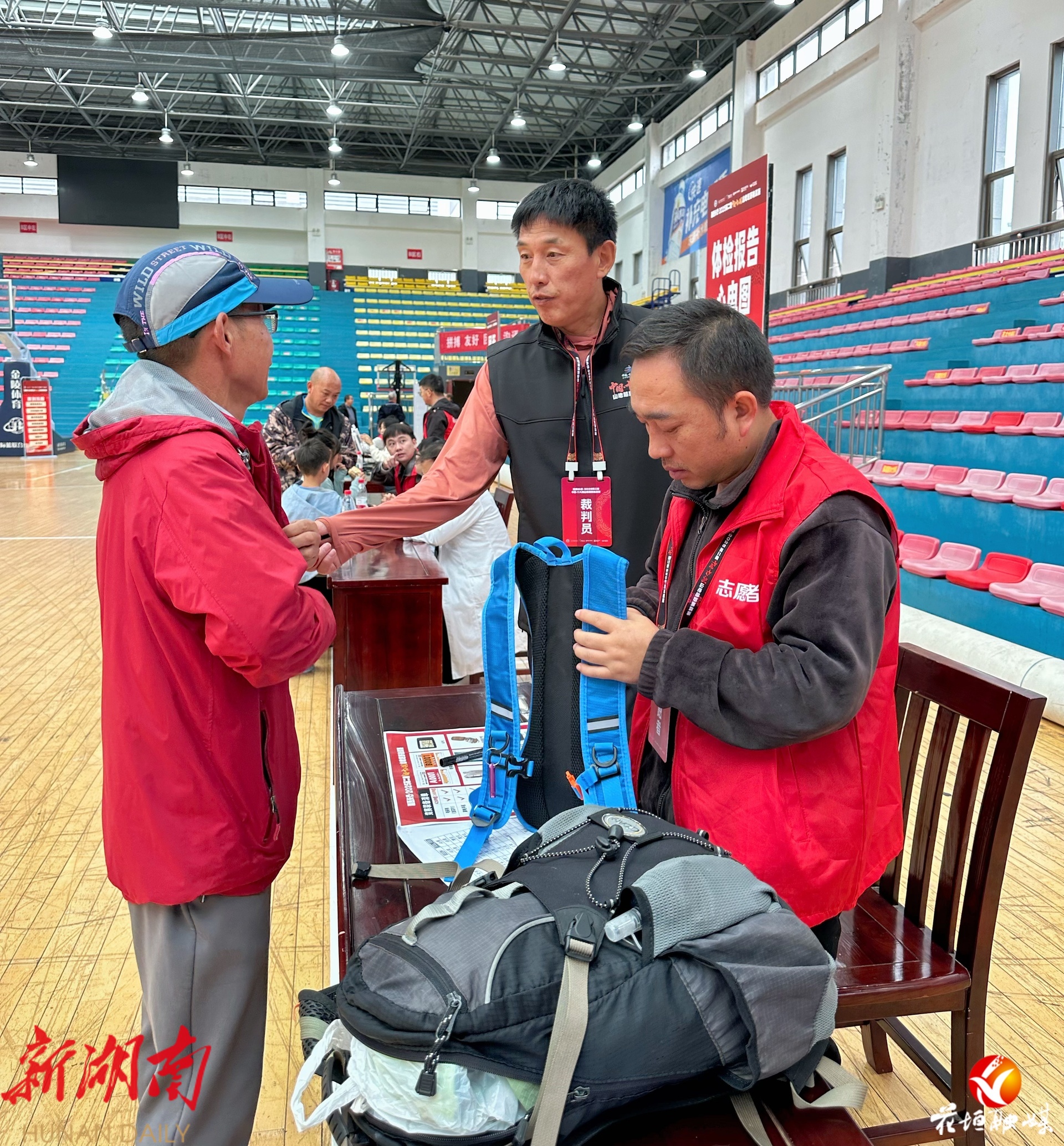 在花垣县全民健身中心物资领取处,前来领取参赛物资的选手络绎不绝。工作人员高效核验个人信息后,迅速为选手发放参赛包,整个流程井然有序。同时,现场还设置了严格的装备检查环节,工作人员对每位选手的竞赛装备进行细致审核,确保符合赛事安全标准,为参赛选手的山野挑战筑牢第一道安全防线。