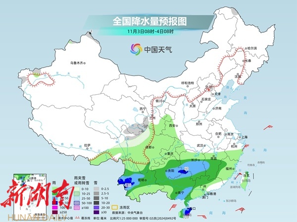 明天,黑龙江西北部、新疆北疆北部和南疆西部山区、西藏东北部、青海东部、甘肃西南部、川西高原北部等地部分地区有小雪或雨夹雪,局地有中雪。江南南部和西部、西南地区南部、华南大部等地部分地区有中到大雨,其中,湖南南部、云南西南部、海南岛东部等地局地有暴雨或大暴雨。