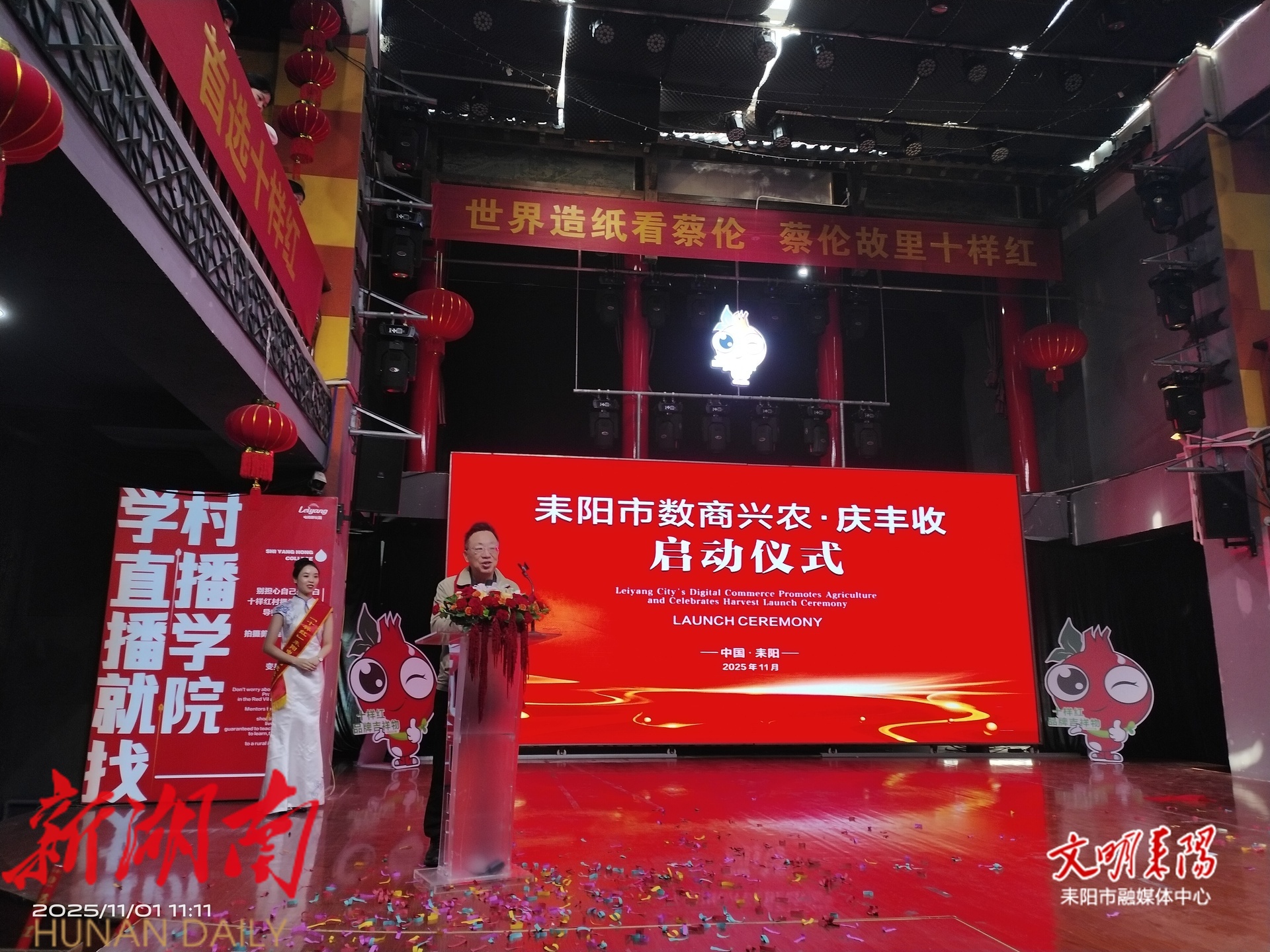 衡阳市商务局三级调研员罗爱民,耒阳市政协副主席、文旅广体局局长陆小勇出席活动。耒阳市委社会工作部、市委统战部、市工商联、市融媒体中心、市商务局、市供销社、市民间管理局、市总工会等相关部门负责人,合鸣时代公司、湖南食味康粮油有限公司董事长段恒、耒阳市夏塘张心国食品厂厂长张衡等合作企业代表及社会各界嘉宾共同见证。活动现场,耒阳市文化馆、文化志愿者艺术团带来《乡村振兴唱起来》表演,营造出喜庆热烈的发展氛围。
