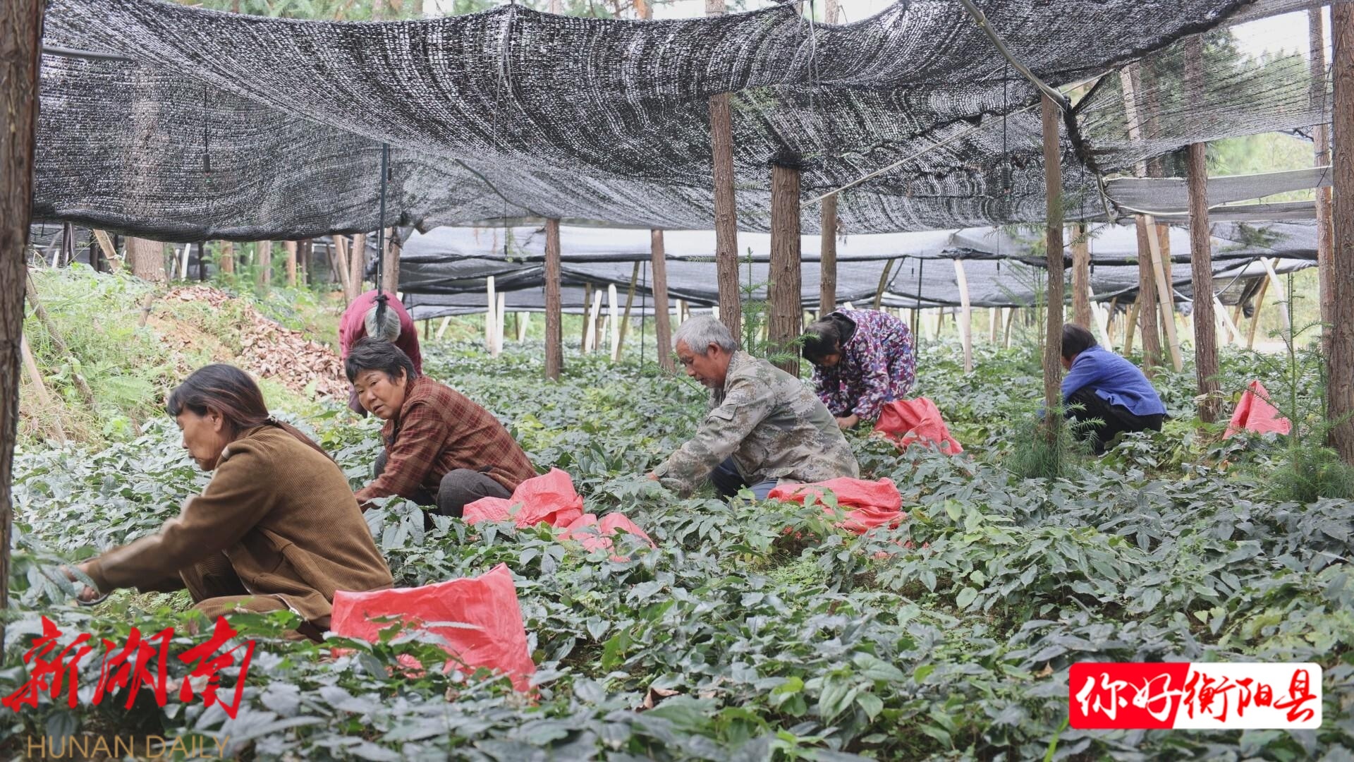 衡阳县融媒11月2日讯(记者:贺子怡 吴展名 廖辉煌) 眼下,库宗桥镇虎形村的淫羊藿正值集中采收期,村民们抢抓农时,忙着收割、搬运、晾晒淫羊藿。一株株淫羊藿从林间走向药厂,成为带动百姓增收、赋能乡村振兴的“金叶子”。