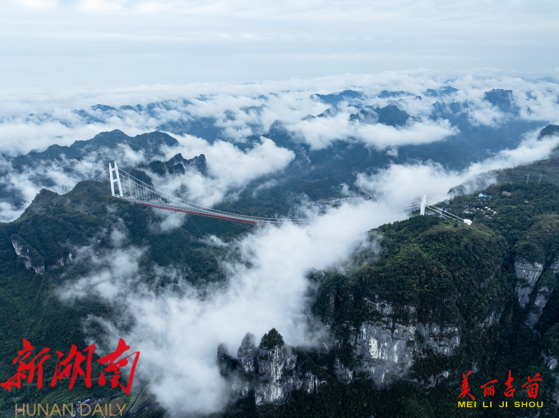 吉首市融媒体中心11月3日讯(全媒体记者 彭璟)11月2日,吉首市矮寨大桥附近雨后云海翻腾,大桥、峡谷、峰峦在云雾中时隐时现,宛如仙境,构成了一幅雄伟壮阔的自然画卷。
