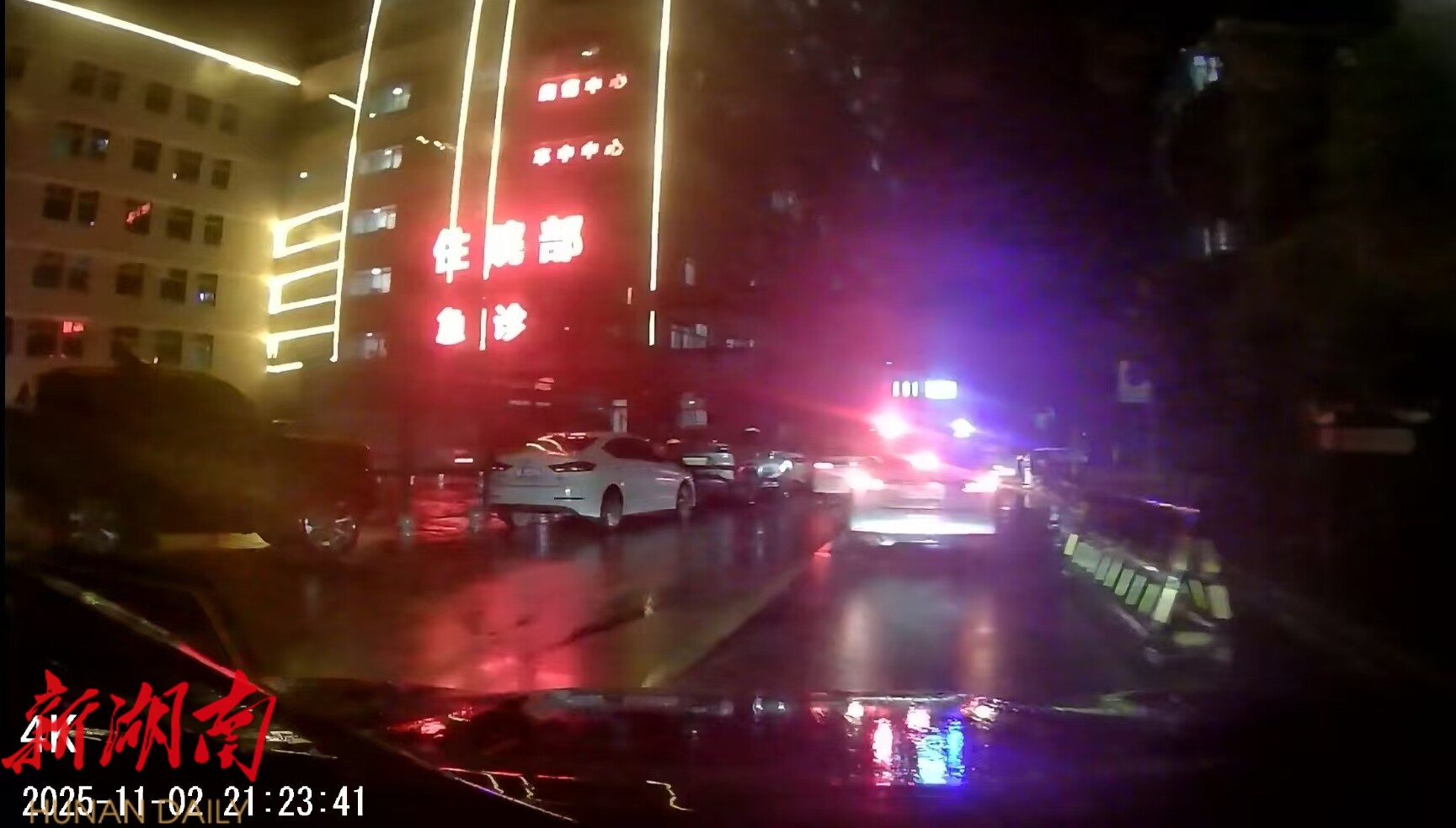 30公里的路程,警车雨刷器从未停止过,民警的目光紧紧锁定前方路况,双手稳稳把控方向盘,每一次转向、每一次减速都精准果断——他们知道,方向盘的另一端,连着两条生命的安危。最终,在三中队值班民警的全力护送下,经过紧张的30分钟,载有孕妇的车辆稳稳停在永兴医院急诊楼前。