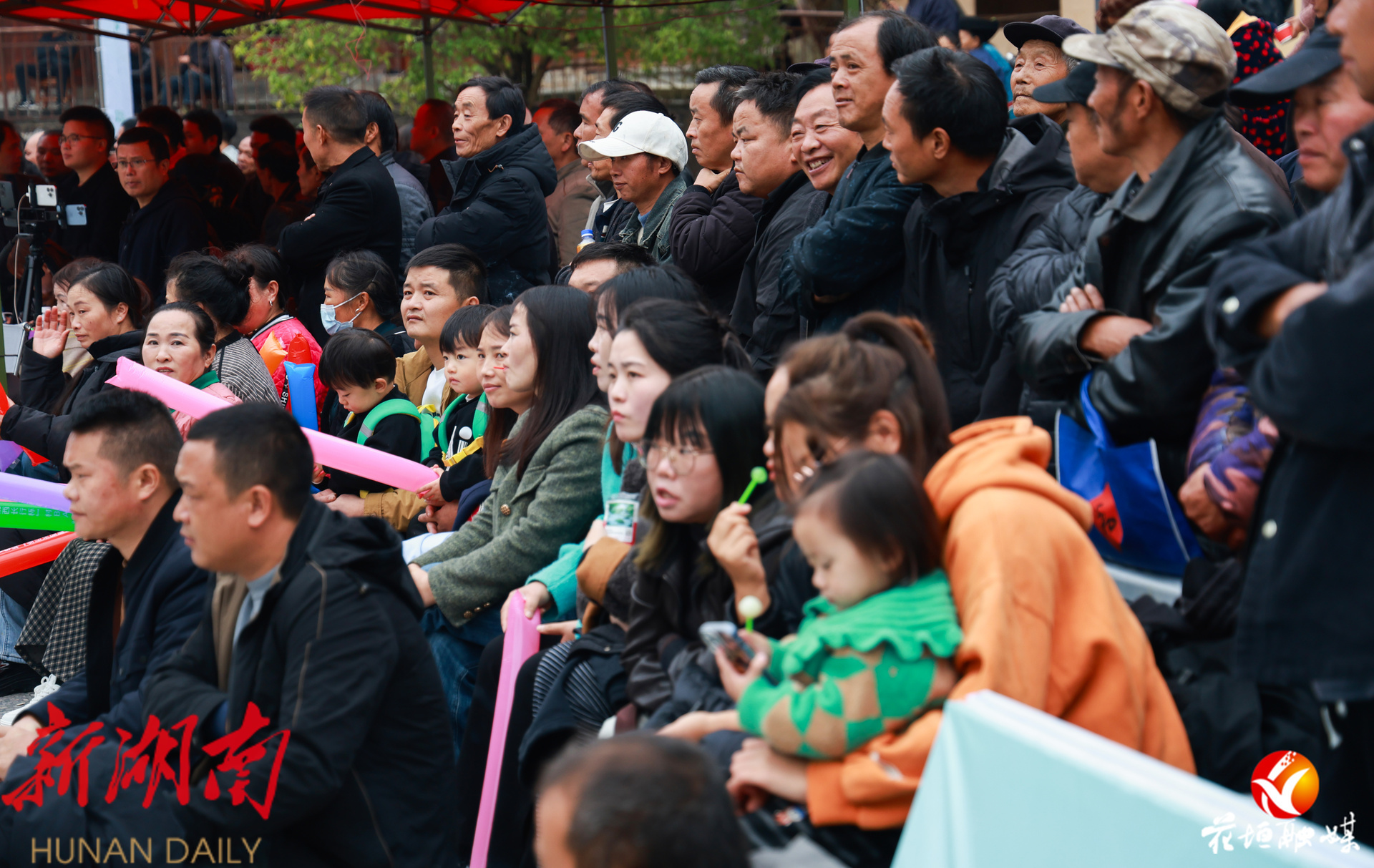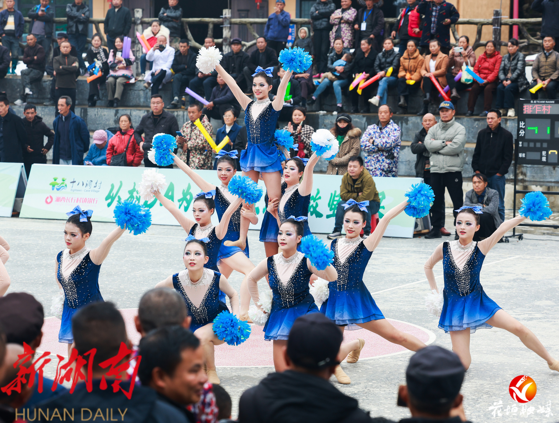 赛事不仅是篮球竞技的舞台,更成为全民共享的欢乐节日。中场休息期间,湘西职院舞蹈专业学生带来的《啦啦操》活力四射,进一步点燃现场氛围。村民投篮互动环节通过趣味投篮派送小礼品,让男女老少共同感受运动的快乐,生动诠释了“村BA”扎根乡土、服务群众的独特魅力。