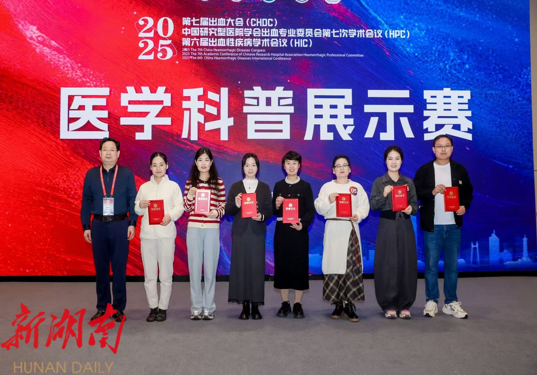 湖南日报·新湖南客户端11月5日讯(通讯员 邓燕芳 )近日,2025年第七届出血大会护理论坛在长沙国际会议中心成功举办。永兴县人民医院急诊科团队积极参与大会系列活动,并在医学科普展示赛中表现优异,其参赛作品《上消化道大出血的预防》科普视频荣获三等奖。