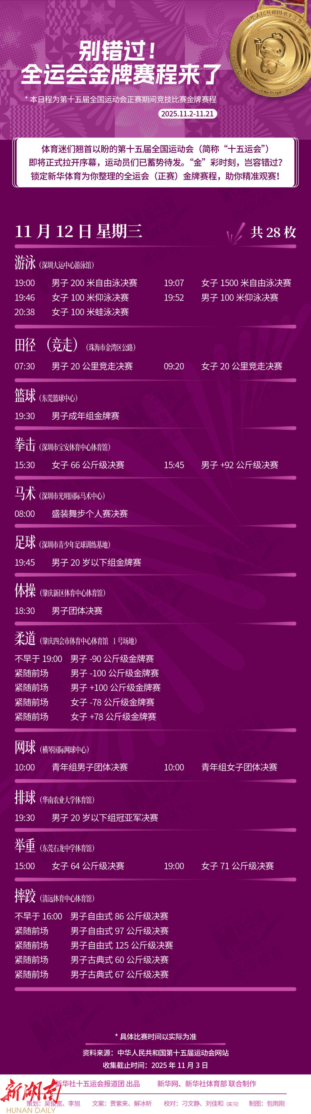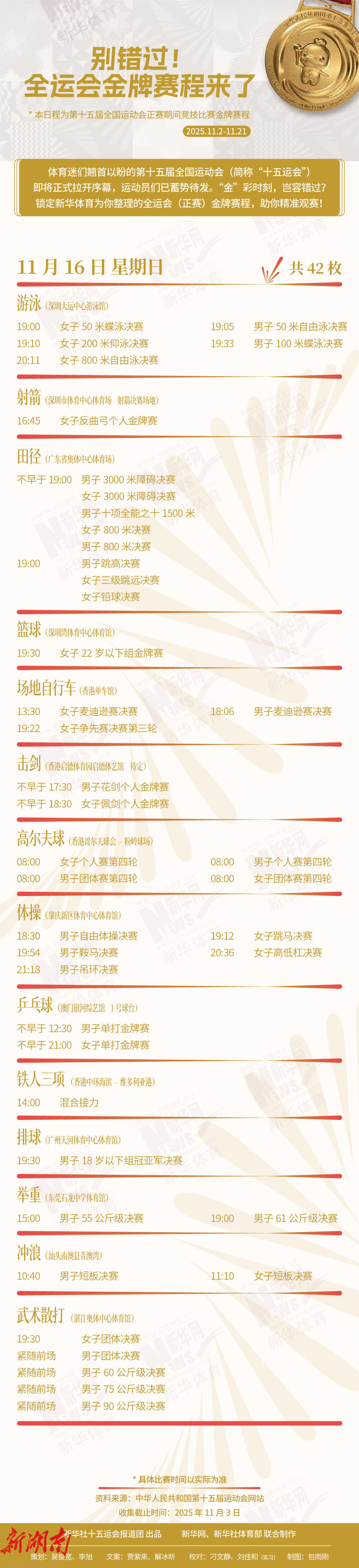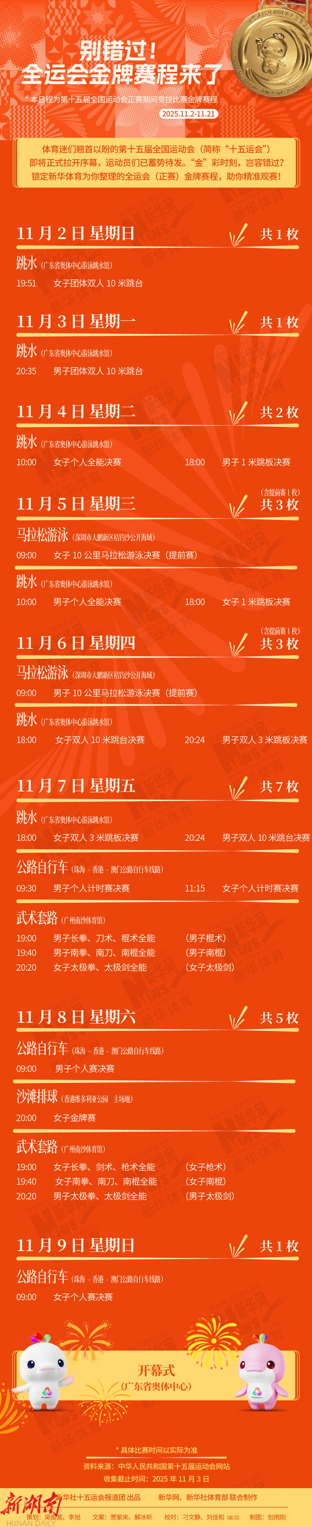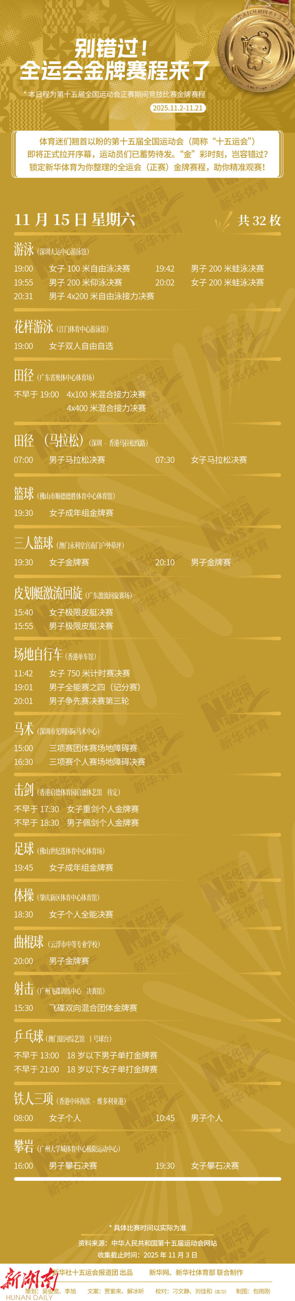 体育迷们翘首以盼的第十五届全国运动会(简称“十五运会”)即将正式拉开序幕,运动员们已蓄势待发。“金”彩时刻,岂容错过?锁定新华体育为你整理的全运会(正赛)金牌赛程,助你精准观赛!