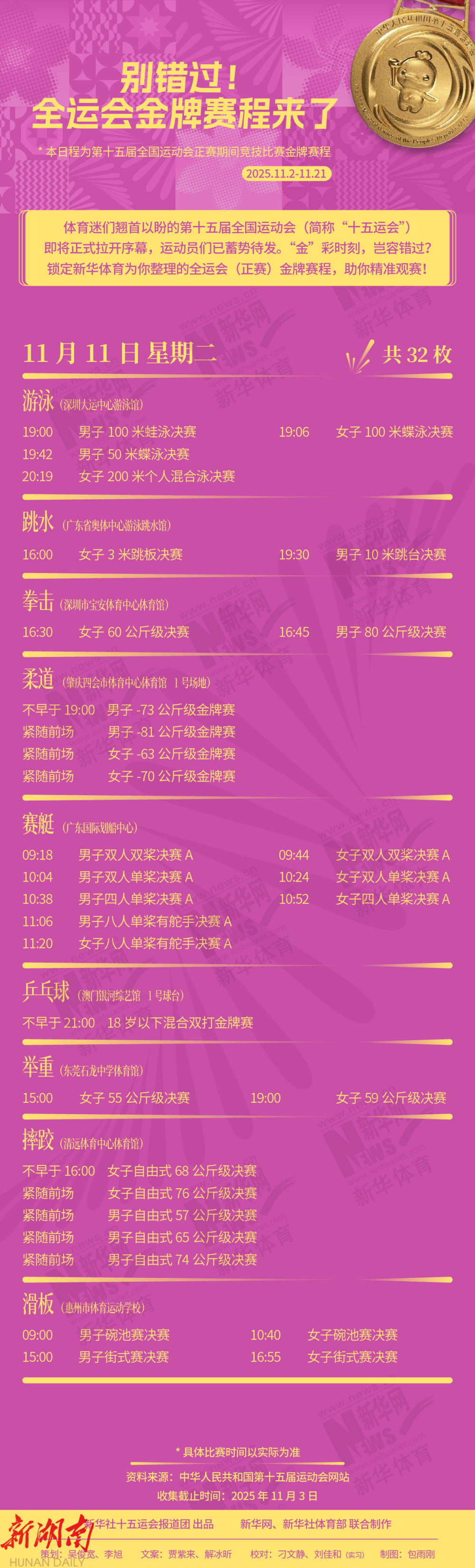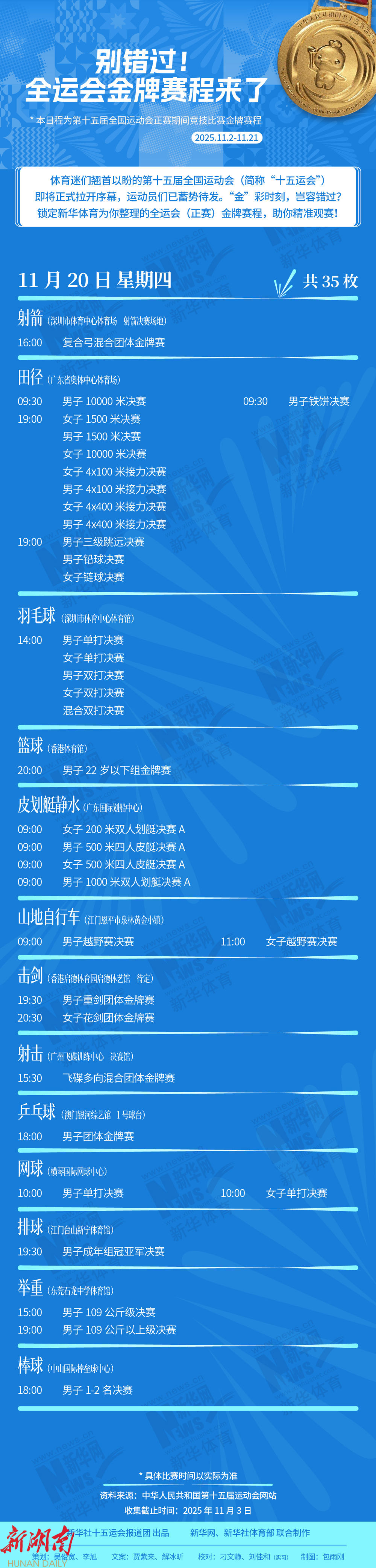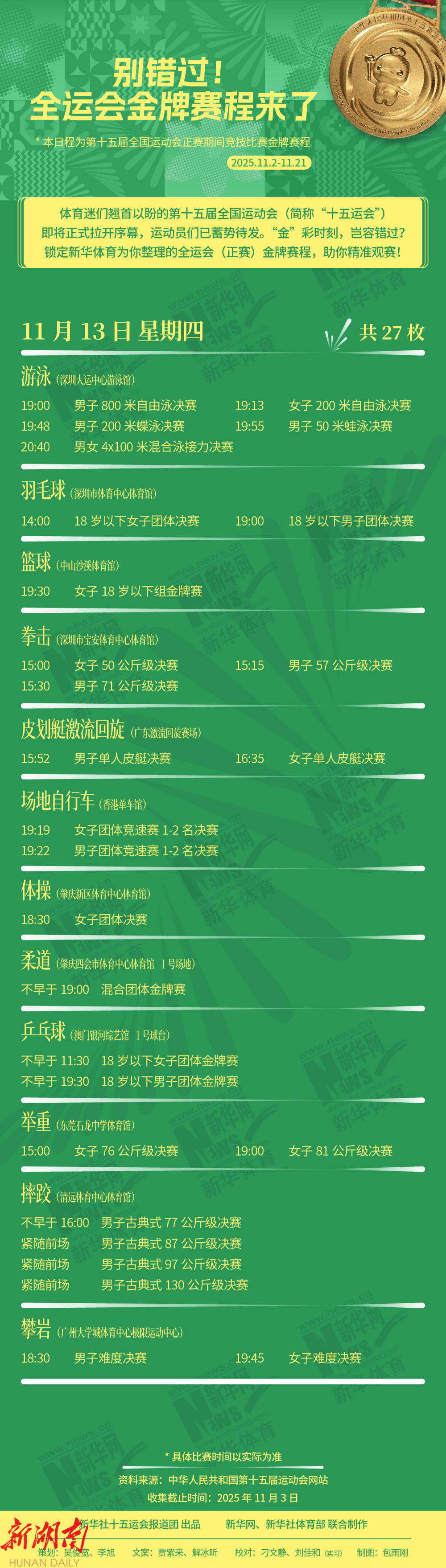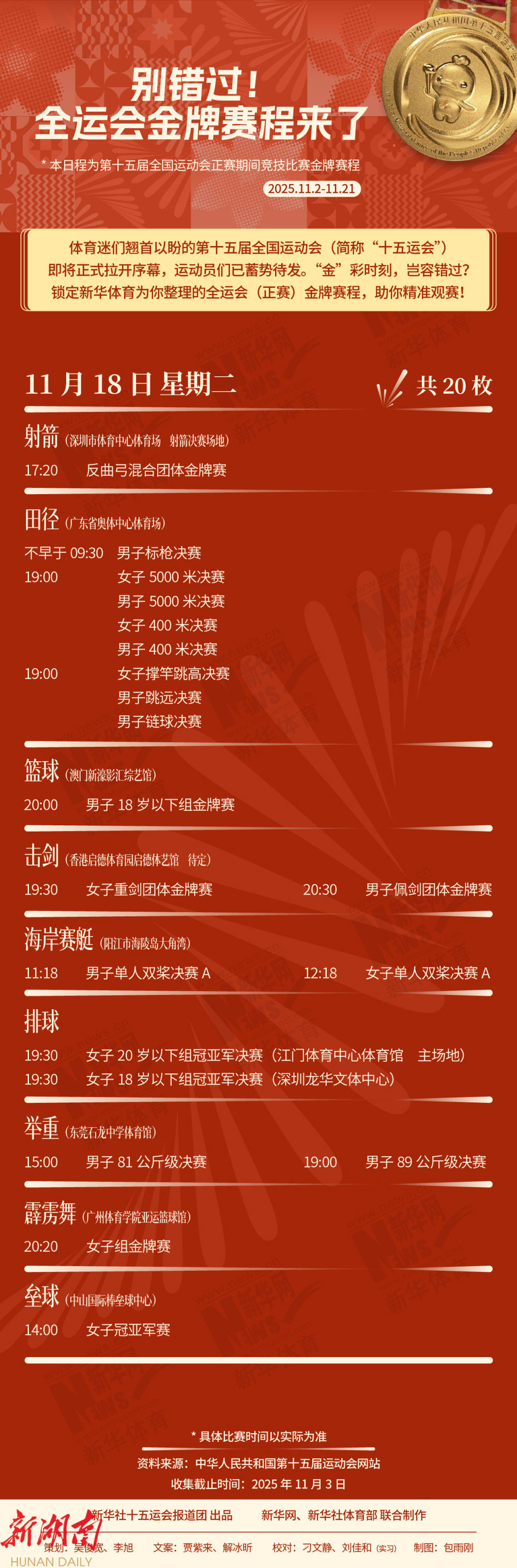 体育迷们翘首以盼的第十五届全国运动会(简称“十五运会”)即将正式拉开序幕,运动员们已蓄势待发。“金”彩时刻,岂容错过?锁定新华体育为你整理的全运会(正赛)金牌赛程,助你精准观赛!