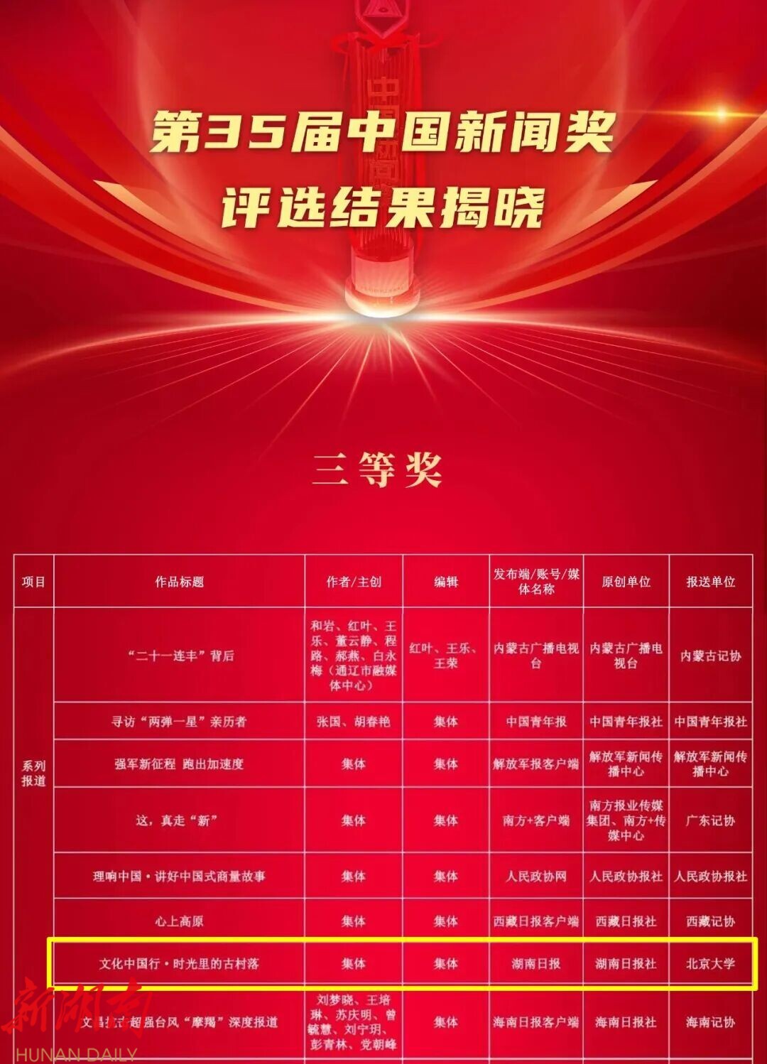湖南日报·新湖南客户端11月6日讯 11月5日,由中华全国新闻工作者协会主办的第35届中国新闻奖评选结果揭晓。湖南日报社联合永兴县委宣传部采编的《文化中国行·时光里的古村落》作品荣获中国新闻奖三等奖。
