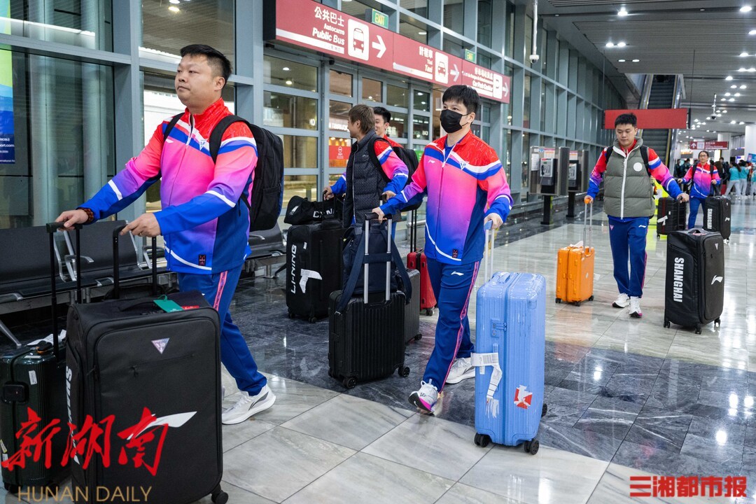 樊振东随上海乒乓球队抵达澳门。(新华社图)