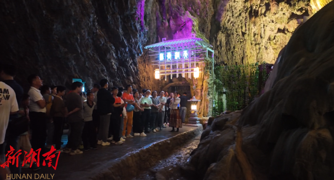 九嶷山景区是国家4A级旅游景区,其中核心景区紫霞岩以其神奇壮观的喀斯特地貌闻名遐迩。步入岩洞,仿佛走进一个奇幻的地下宫殿。这座拥有万年历史的天然岩洞内钟乳石、石笋、石柱等景观千姿百态,在五彩灯光的映照下,更显绚丽多彩。景区还新增 “舜帝传说” 互动剧情与沉浸式表演《二妃寻夫》戏剧演艺,通过溶洞场景与光影技术的结合,生动演绎舜帝与二妃的动人传说,让游客仿佛穿越时空,亲身感受这段跨越千年的爱情故事。与旅游高峰期的人流密集不同,错峰而来的游客得以从容漫步,细细欣赏大自然的鬼斧神工。“今天来到紫霞岩,游客也没有国庆长假那时候那么拥挤,我们不用长时间排队和等待,可以有更多的时间去看、去走,我感觉非常舒心、快乐。”“九嶷山这个风景区,真的不虚此行。