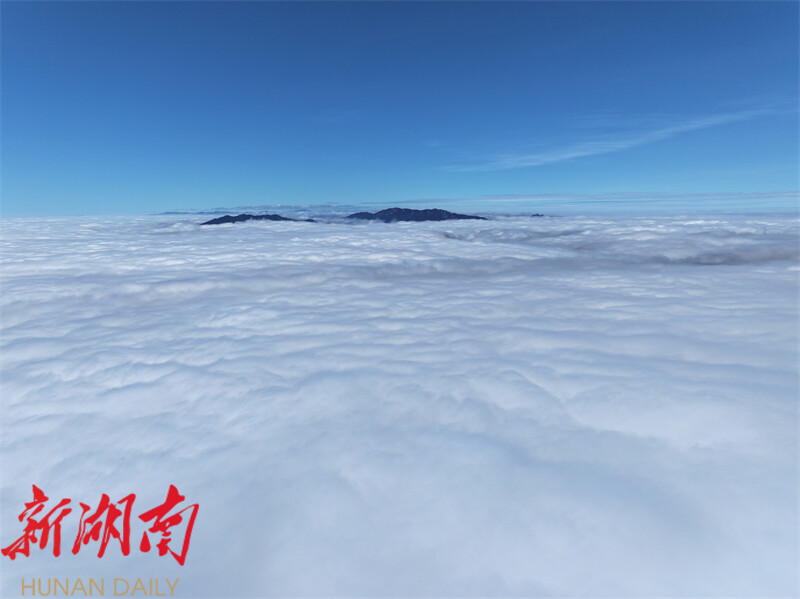 新桂阳11月7日讯(记者 陈勇 欧阳宇轩)11月6日,雨后初霁,在我县欧阳海二期风电场,一座座百米高的“大风车”在山岚云海中巍然耸立、迎风转动,风力发电机与云海若隐若现构成一道靓丽的风景线。连绵山脊之中,白色风机矗立云海之间,与远山、蓝天相映成趣,若海市蜃楼、缥缈仙宫,勾勒出一幅生态与科技交融的壮丽画卷。
