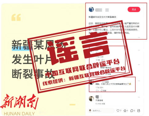 真相 : 近日,有网民发帖称:“国家电投新疆塔城某风场发生风机叶片断裂事件”,引发关注。经国家电投集团新疆能源化工额敏有限责任公司核实,其在新疆塔城区域布局风电项目共7个,均未发生安全事故,帖文所述内容不实。(来源:“新疆网络辟谣”微信公众号)