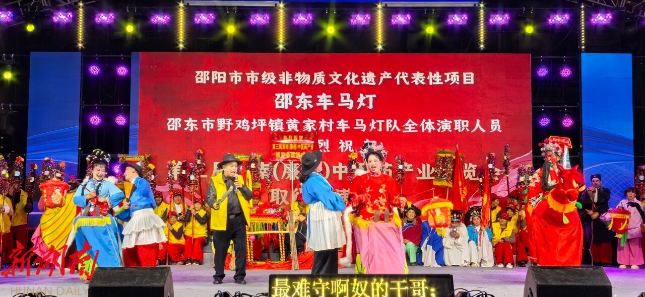 作为邵阳市级非物质文化遗产代表性项目,邵东车马灯一直以欢快灵动的表演形式、热烈奔放的艺术风格为主要特色,是邵东市春节期间重要的文化盛宴。邵东车马灯代表性传承人唐志平介绍,此次为药博会量身打造的巡演,在传统形式基础上融入鲜明药都主题,创新加入药王孙思邈、悬壶济世船、小药童、吉祥仙鹤等形象,通过流动的戏剧场景,生动讲述廉桥作为“南国药都”的千年传承与济世精神。