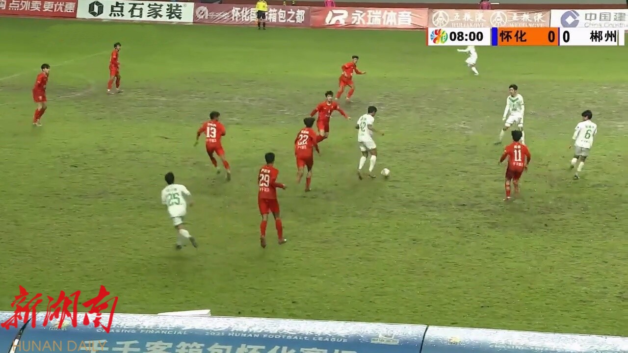 比赛伊始,郴州队大举压上,但雨水致场地湿滑,球员多次滑倒,足球轨迹难控。双方你来我往,均势明显。第36分钟,郴州队多次威胁球门未果。伤停补时,怀化队单刀进攻,郴州队守门员刘翔精彩扑救,但怀化队抓住最后一次进攻机会,22号伍宏卓角球破门,上半场怀化队1:0领先。