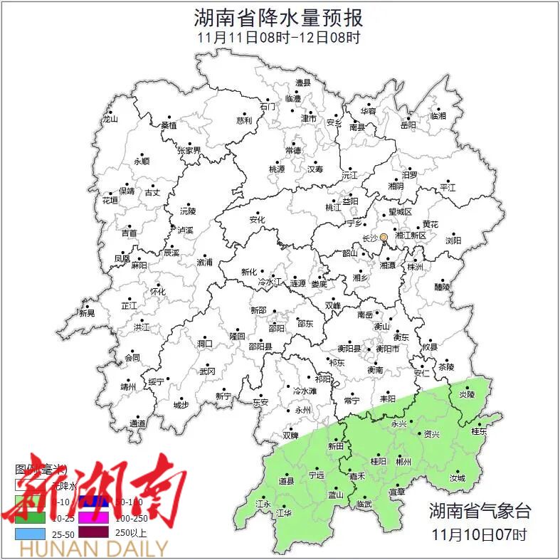 据省气象台预测,今天全省阴天有小雨;11日开始天气逐渐转好,省内以晴天间多云天气为主,最高气温逐渐回升,昼夜温差较大,其中14日、15日清晨湘中以南有雾。注意防范今天阴雨天气和14日、15日清晨湘中以南大雾天气对出行安全的影响。