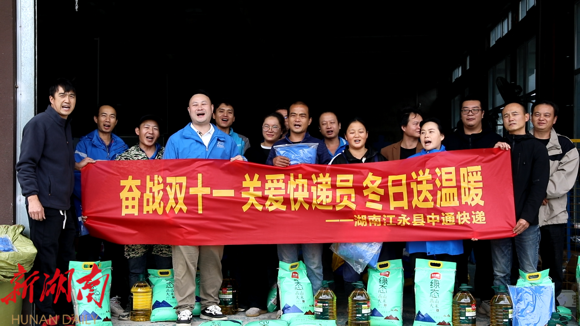 江永中通快递员邓伯原笑言:“天越冷,心里越热乎。公司送来新棉衣、米面油,浑身是劲儿!今年不光送快递,也头回当回‘收货人’。”