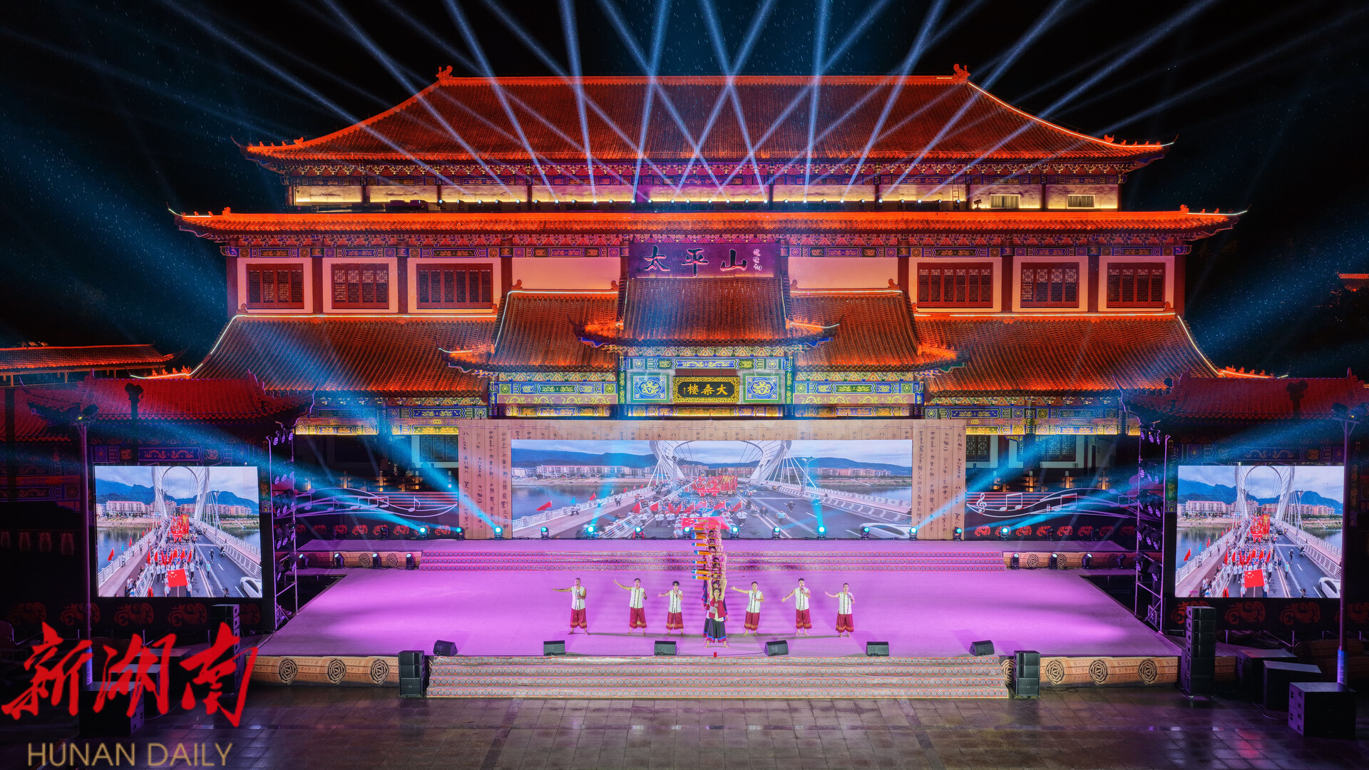 当晚7时18分,展演活动在浓郁的土家文化氛围中拉开帷幕。随后,龙山县带来的开场舞《太平盛世》震撼登场,以恢宏的气势和优美的舞姿,展现了湘西人民的幸福生活和太平盛世的繁荣景象,正式拉开了展演活动的序幕。