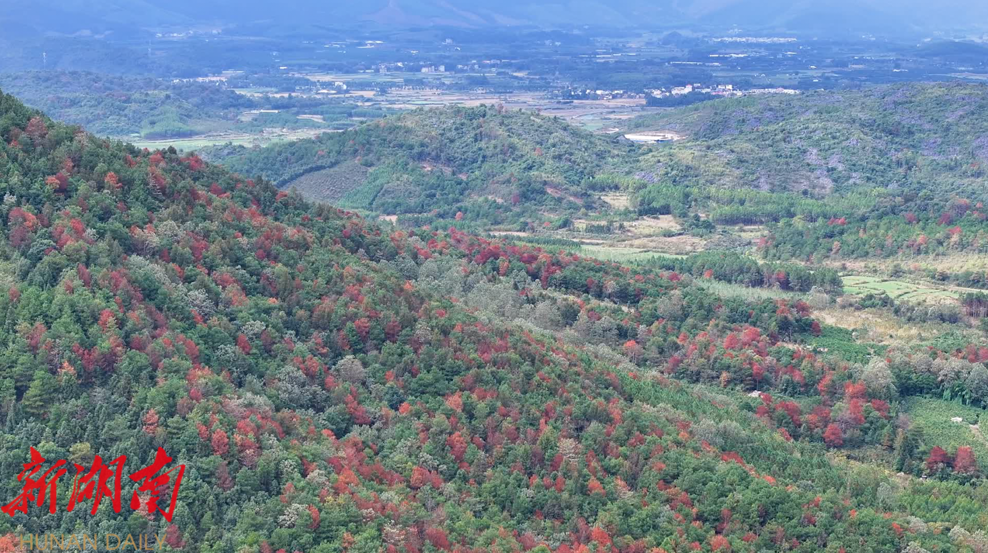 航拍镜头下,阳光洒满山林,漫山红叶如火似霞、艳丽夺目。苍翠的松柏、金黄的稻田与火红的枫叶交相辉映,层次分明、相映成趣,构成了一幅意境悠远的冬日生态画卷。微风拂过,枫叶轻摇、沙沙作响,尽显自然灵动生机。