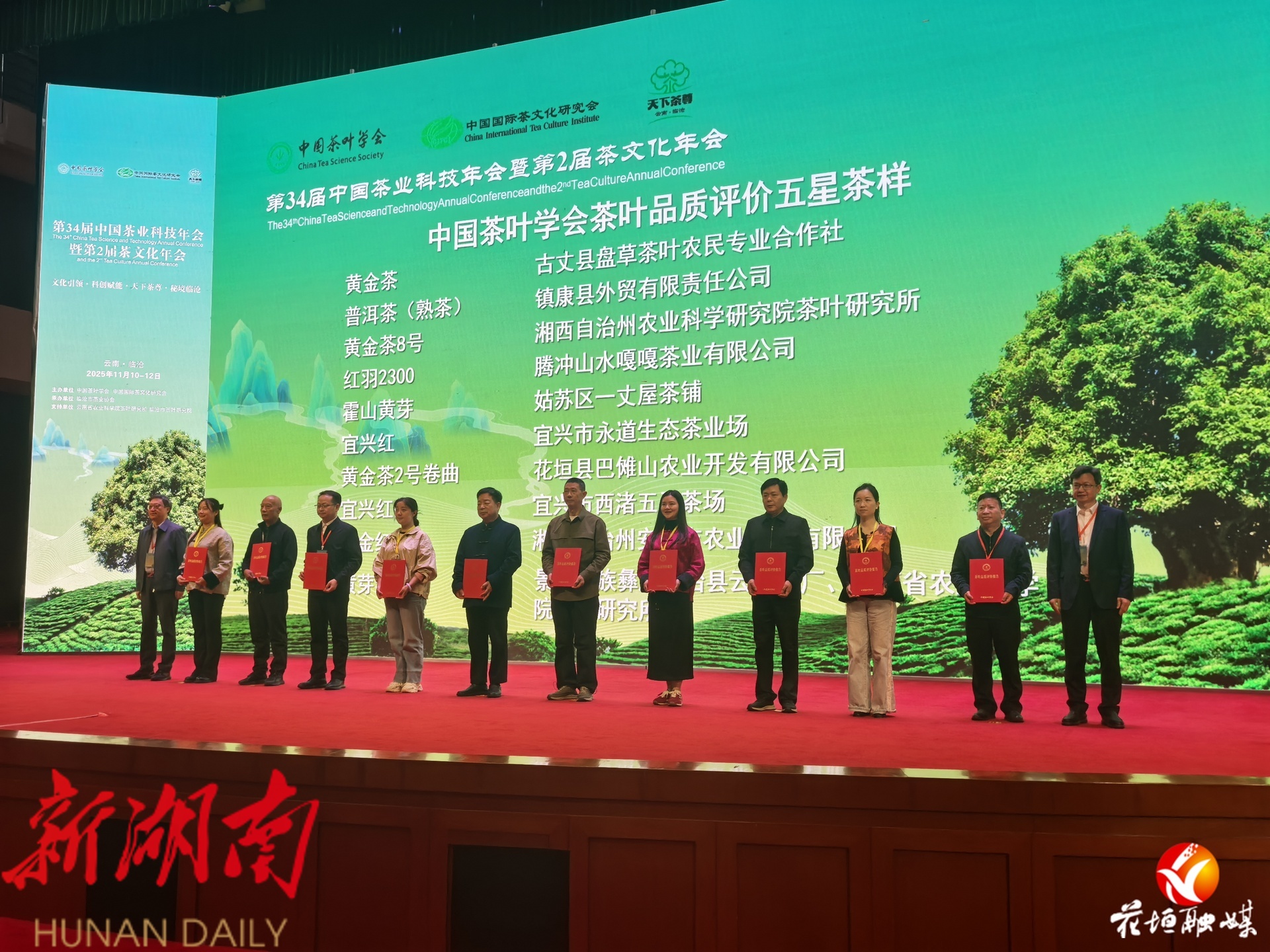 湖南日报·新湖南客户端11月11日讯(通讯员 肖引霞)11月10日至12日,第34届中国茶业科技年会暨第2届茶文化年会在云南临沧举办。年会现场,花垣县巴傩山农业开发有限公司选送的“黄金茶2号卷曲”绿茶样品,凭借其工艺精湛、品质优异、特色突出的综合表现,经权威专家评审,被认定为达到“五星名茶”品质标准。