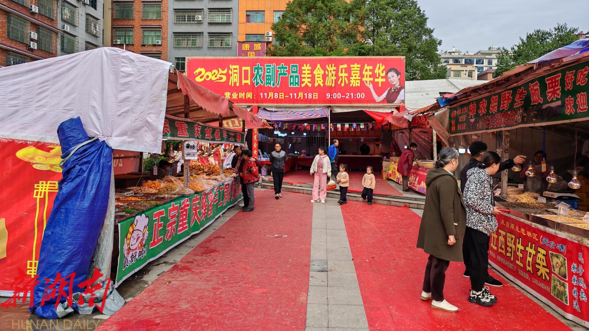 洞口融媒11月12日讯(记者:胡涛) 11月12日,记者在县汽车总站站前广场看到,一场汇集南北特色的农特产品在此展销,往来市民被各类乡土风味吸引,驻足试吃、询价下单,现场一派购销两旺的鲜活景象。