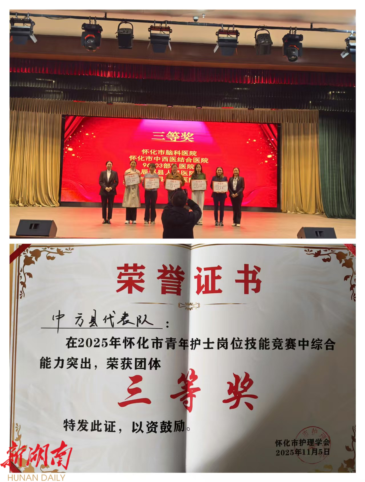 中方融媒11月12日讯 (通讯员:夏一文) 近日,以“锤炼技能,提升服务,促进发展”为主题的2025年怀化市青年护士岗位技能竞赛中,中方县人民医院凭借扎实的专业功底、过硬的临床实践能力和良好的团队协作精神,荣获“团体三等奖”及多项个人“优胜奖”,这一荣誉,是该院护理团队整体实力和卓越风采的精彩展现,同时也为医院高质量发展写下了浓墨重彩的一笔。