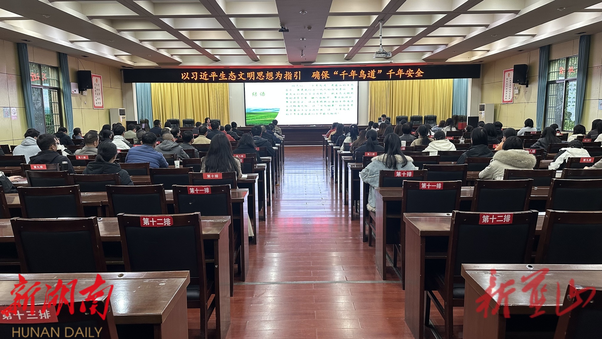 课堂上,邓群围绕习近平生态文明思想、候鸟迁徙生态格局、蓝山县候鸟保护实践成果、当前候鸟保护严峻形势等内容展开详细阐述,通过“理论+案例”相结合的方式,深入解读了守护“千年鸟道”所肩负的政治责任,阐释了“千年鸟道”在生态全局中的重要地位,并就如何筑牢“千年鸟道”安全屏障、确保“千年鸟道”千年安全提出了具体实措。