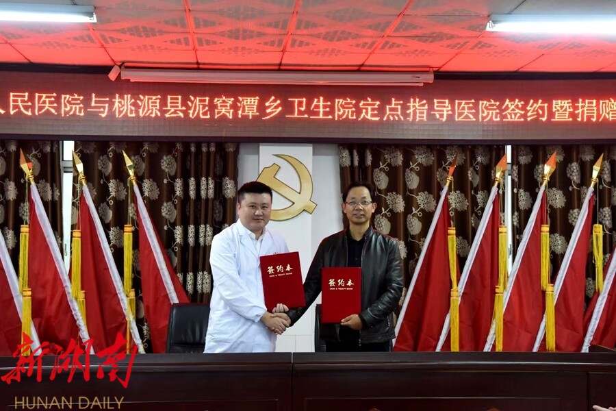 仪式现场,常德市第一人民医院副院长尹明祥代表市一医院与泥窝潭乡卫生院负责人签署《定点指导医院合作协议书》。市一医院将充分发挥三甲医院技术优势与管理经验,以技术帮扶、人才培养、专家坐诊、远程会诊、双向转诊为核心,建立常态化协作机制,通过“传帮带”精准助力卫生院完善学科建设、规范诊疗流程,全面提升基层医护人员诊疗能力,打造“带不走的医疗队”。