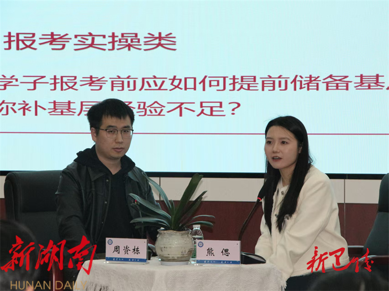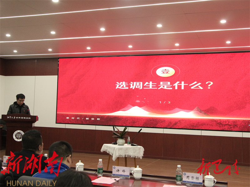 湖南日报·新湖南客户端11月13日讯(通讯员 周资栋 万鑫苗) 在湖南省2026年选调生选拔公告发布之际,为鼓励更多青年学子扎根基层、建功一线,在服务人民、奉献国家的实践经验中铸牢理想信念,锚定“三高四新”美好蓝图贡献青春力量。10月31日,杨林街镇副镇长、岳阳县“星火湘伴·法韵青锋”宣讲团成员周资栋走进湘潭大学公共管理学院,以一名湖南省2023年选调生和学校校友的身份,为师生们带来了一场题为“在基层沃土中淬炼青春担当”的专题党课。他结合自身两年来的基层实践经验,用“调、巧、奉、实”四字诀,生动诠释了新时代选调生如何扎根基层、服务乡村、成长成才。