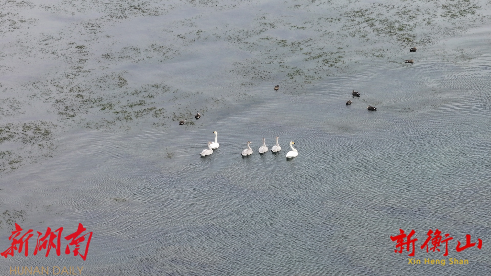 小天鹅一家六口“打卡”湖南衡山萱洲国家湿地公园