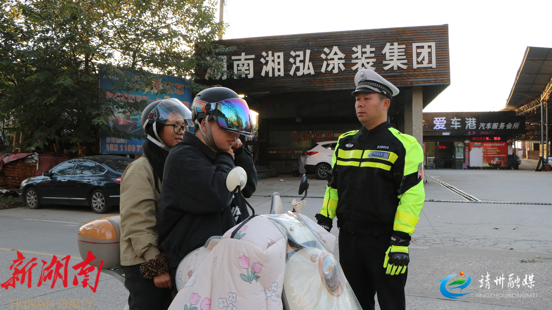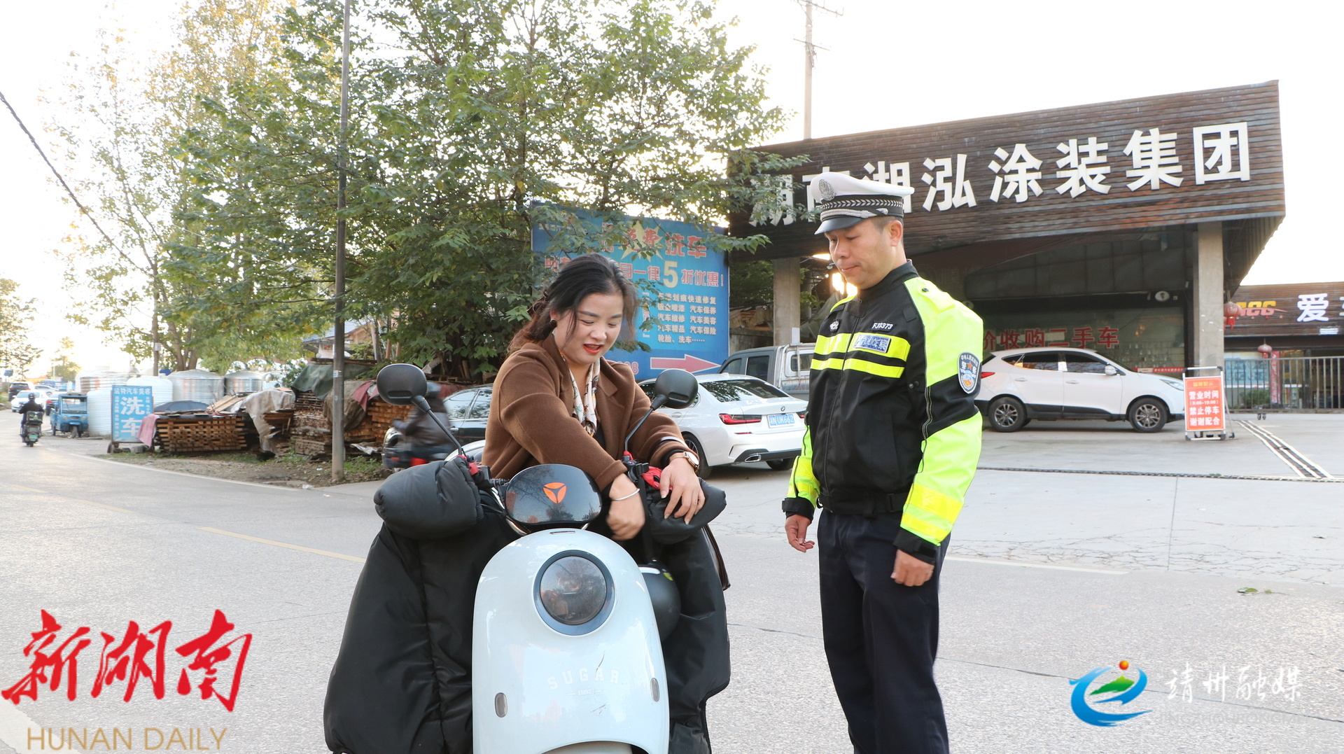 靖州公安局交通管理大队三中队执勤人员劝导教育驾乘人员戴好头盔(夏源懋 摄)