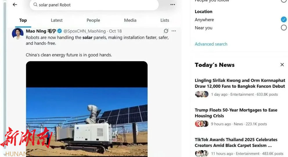湖南日报·新湖南客户端11月14日讯(长沙经开区工作站记者 欧亚琦)近日,外交部新闻司副司长、发言人毛宁在其海外社交平台转发了一台国产光伏机器人作业场景,并附文,Robots are now handling the solar panels, making installation faster, safer and hands-free.China's clean energy future is in good hands。据悉,这台被外交部点赞的智能机器人来自长沙经开区企业福力智洁科技。