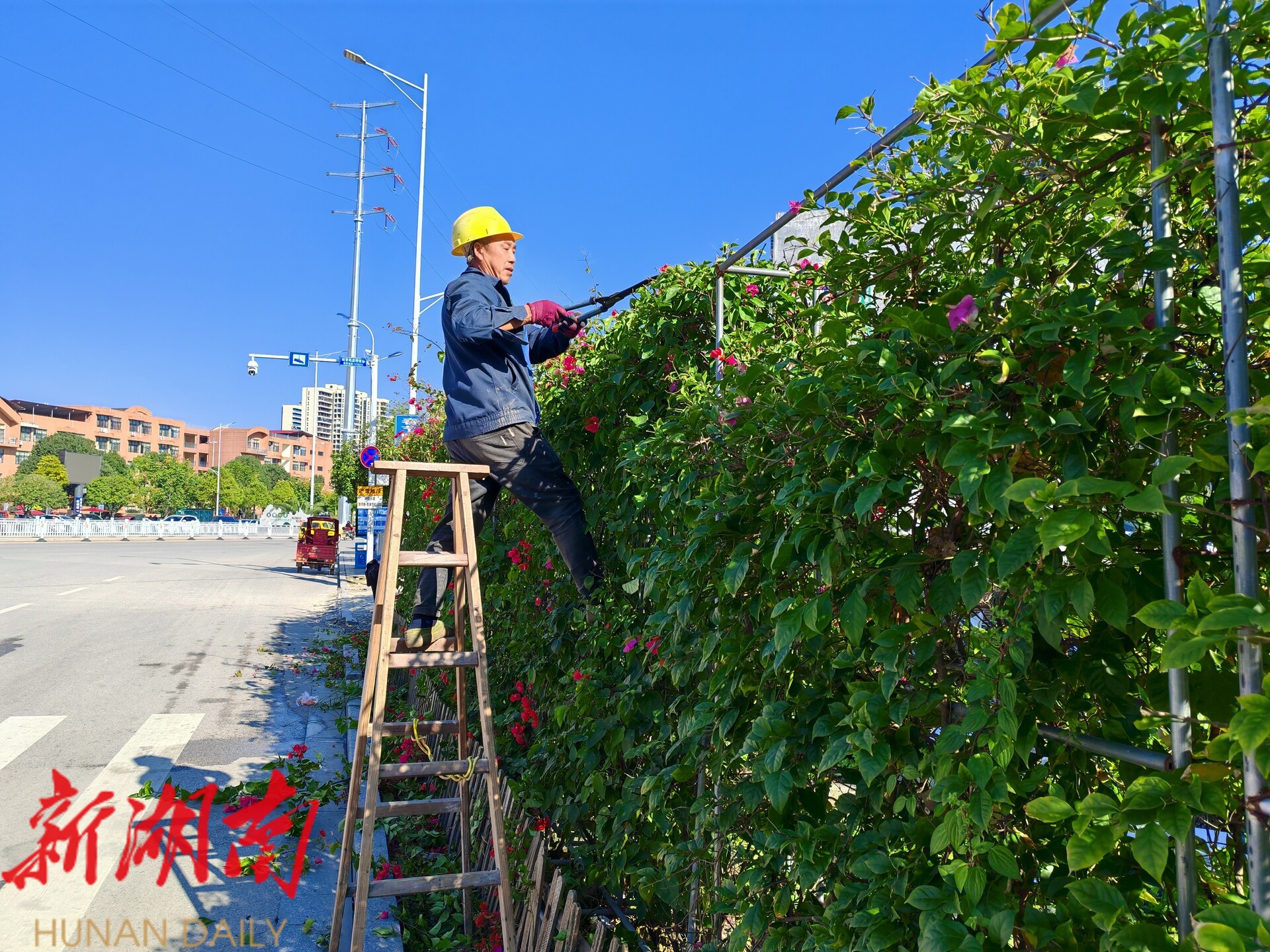 洞口融媒11月14日讯 (记者:胡涛) 11月14日,在洞口大道思源学校路段,环卫工人正有序开展沿街绿篱的冬季修剪工作。他们脚踩木梯,手持绿篱剪,对生长过密的三角梅进行规范整形,一处处原本略显杂乱的绿植逐渐变得整齐有序。