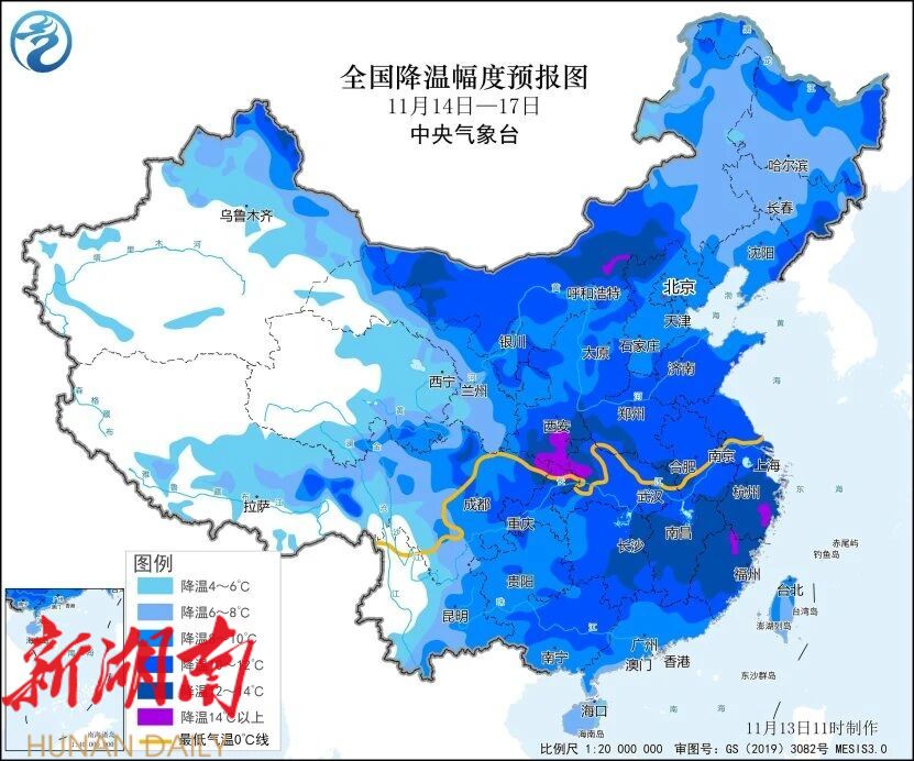 从降温进程看,14日至15日寒潮主要影响新疆北部、甘肃、宁夏、内蒙古中西部,16日至17日继续南下影响中东部地区。过程期间,我国北方和中东部地区气温将普遍下降6—10摄氏度,内蒙古中西部、陕西南部、重庆北部及江南中东部等地降温12—14摄氏度,18日早晨,最低温度零摄氏度线将南压至苏皖南部、湖北北部一带。此外,16日至19日,我国东部和南部海区将先后出现6—8级大风、阵风9—10级。