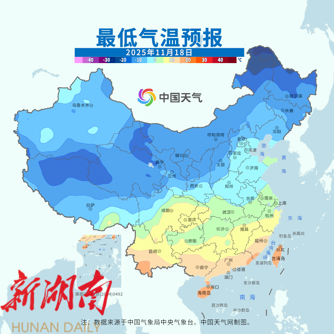 南方最高气温的最低点将集中在明后两天,而最低气温的最低点则集中在18日至19日。像是武汉、南京、合肥,18日和19日的早晨最低气温仅有0℃出头,寒意十足。