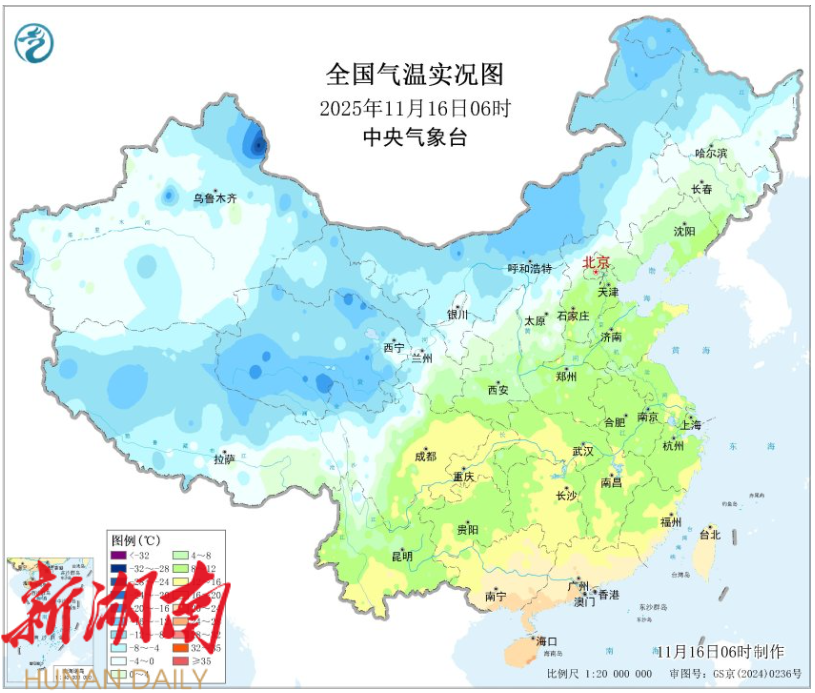 这个周末,北方大部率先领略了下半年首场寒潮的威力。今天(11月16日)清晨,呼和浩特气温首次跌破零下10℃,创下半年来新低;兰州和西宁也双双刷新下半年来气温新低。