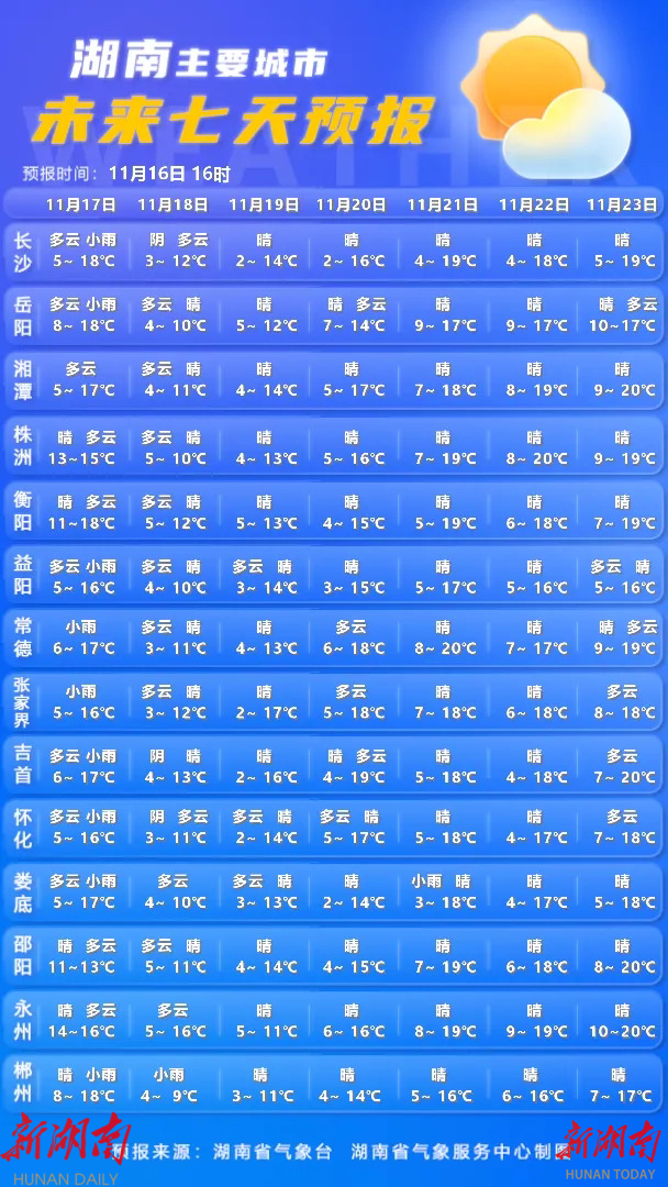 17日晚上至18日白天 ,永州、郴州南部多云到阴天有小雨,其他地区阴天到多云;北风4~6级,局地阵风7~9级;最低气温湘南5~7℃,其他地区2~4℃;最高气温9~13℃。