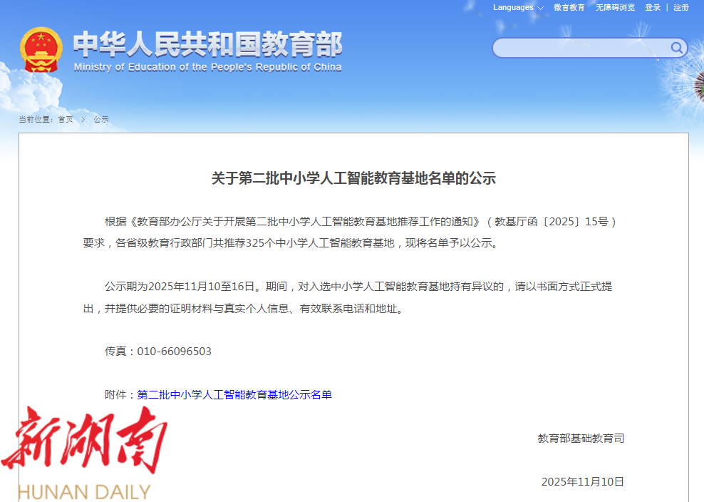 近日,教育部公示第二批中小学人工智能教育基地名单,公示期为2025年11月10至16日。 其中,湖南10所学校进入公示名单,一起来看——