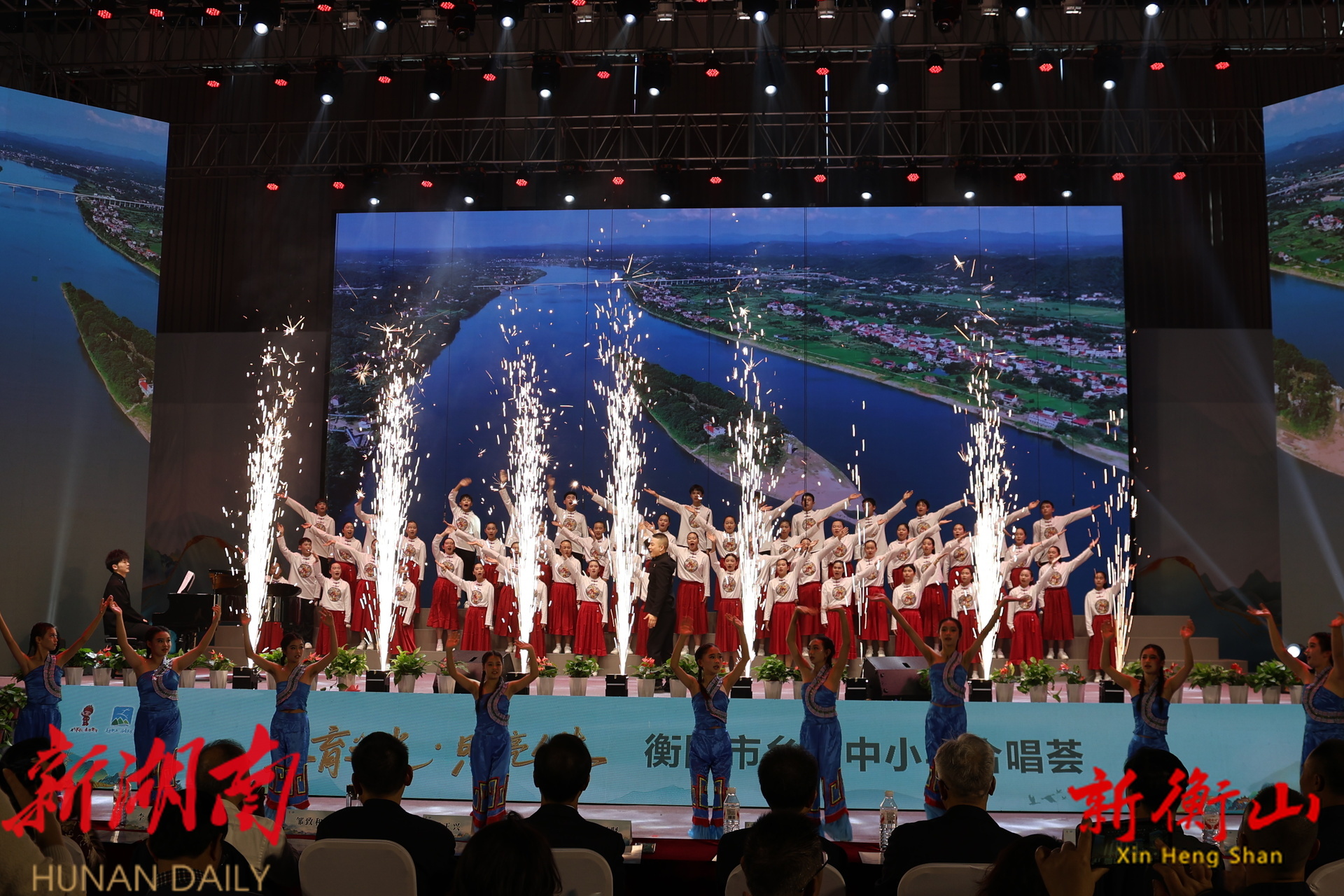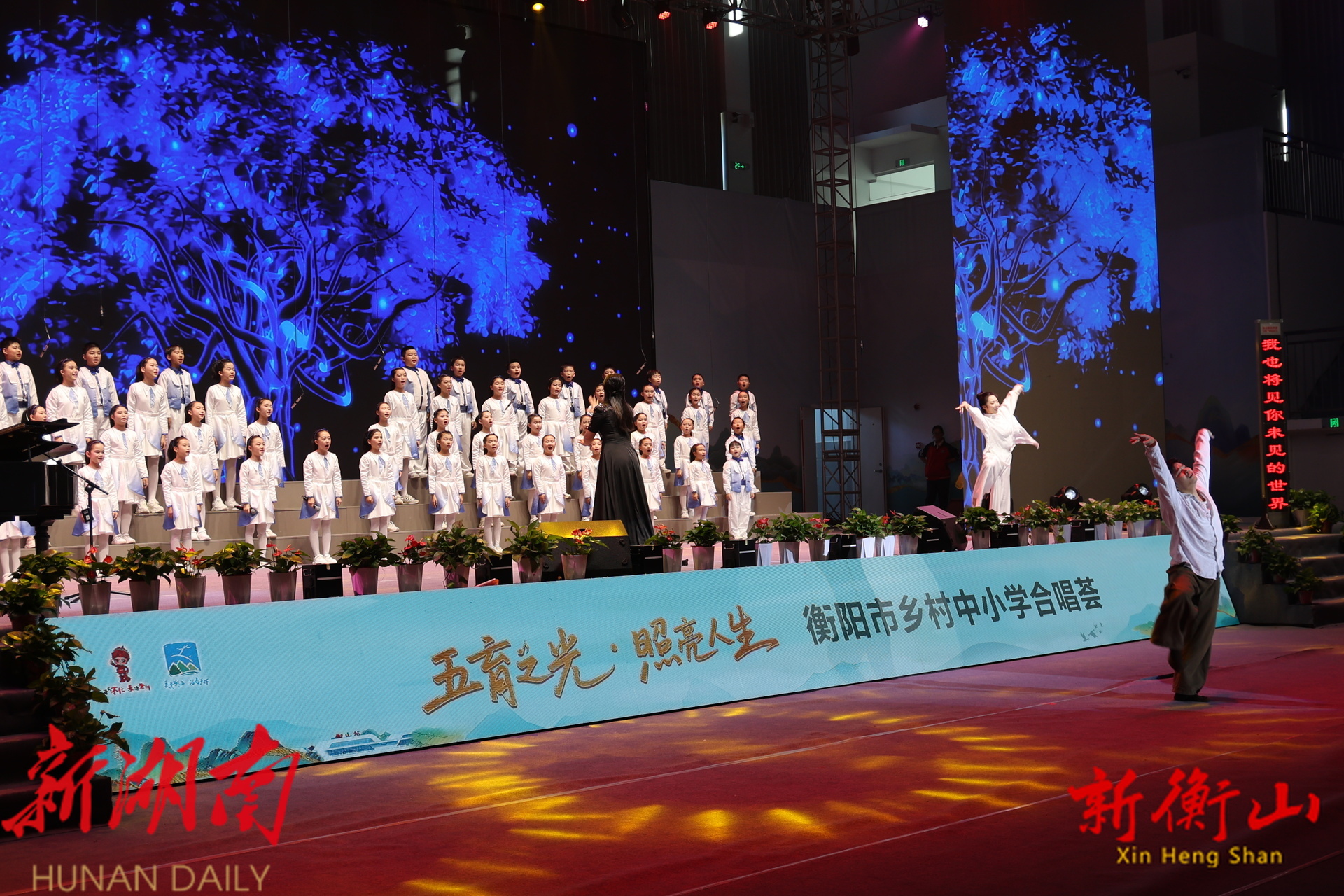 演出共分为“孕育·希望之芽”“成长·追梦之路”“积淀·家国之情”“绽放·未来之光”四个篇章。 衡山县二中的同学们以一曲《青青世界》率先登台,他们自信大方的表演赢得阵阵掌声;南岳区南岳完小带来《送我一朵小红花》,歌声中传递着温暖与坚韧的力量;衡阳县英南学校的《我们都是追梦人》以整齐划一的歌伴舞,展现出新时代少年勇敢追梦的飒爽英姿; 常宁市塔山瑶乡狮园完小与宜阳小学联袂演出的《贵客来》充满民族风情; 衡山县岳云中学的《蓝蓝的夜蓝蓝的梦》为演出画上圆满句号。