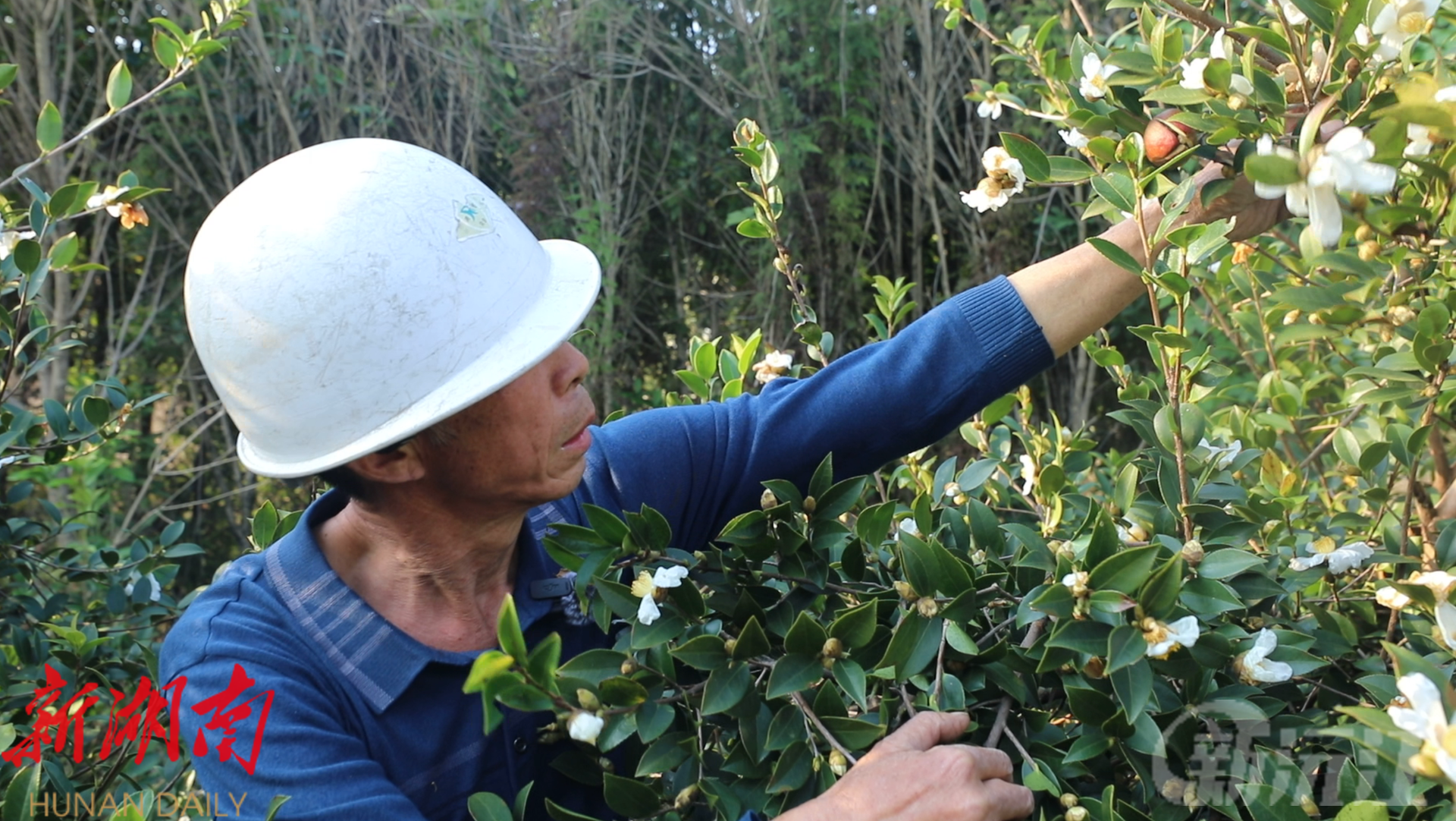 油茶的“花果同枝”是由其独特的生长周期和发育特性所导致。油茶的果实需12至13个月成熟,花期为每年10月至翌年2月,与上一年果实成熟果重叠,形成老果未落、新花已开的花果同枝现象。据冯山保介绍,三眼塘村的油茶自2012年开始种植,当年从株洲攸县引进种苗,试种期间,发现油茶非常适应当地的丘陵土壤和气候,短短十几个年头,油茶林就发展壮大到三千多亩。今年的天气风调雨顺,三眼塘村的油茶喜获丰收。