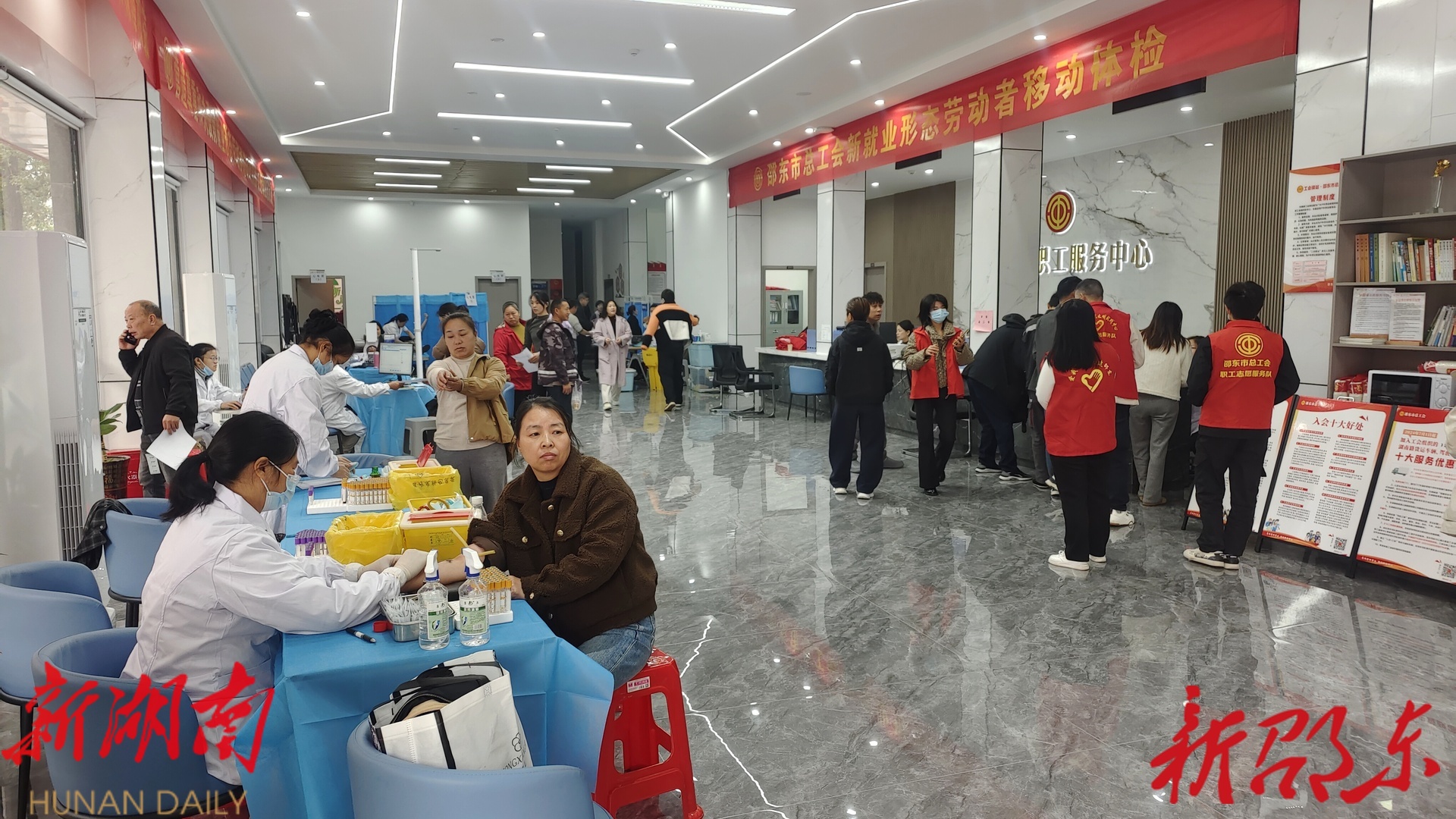 新邵东客户端11月17日讯(记者 邓远 实习记者 王小丽 ) 11月17日,邵东市总工会开展2025年新就业形态劳动者移动体检活动。300余名货车司机、快递员、外卖配送员、户外劳动者等参加体检。