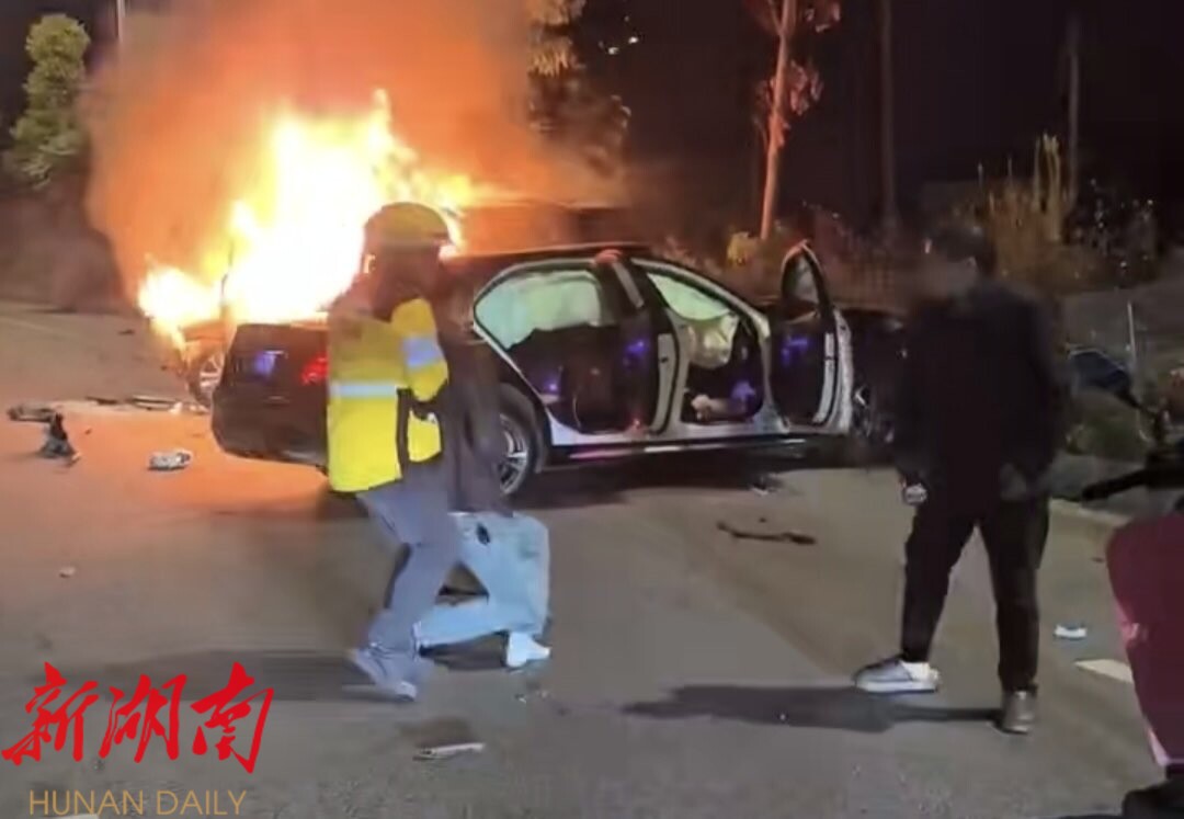 11月16日凌晨,邵东市北岭路突发车祸,导致一辆汽车起火、驾驶员昏迷被困。危急时刻,47岁的外卖骑手邓亚群不顾危险,果断冲入起火车辆,成功将昏迷司机救出,完成了一场与时间赛跑的生命救援。