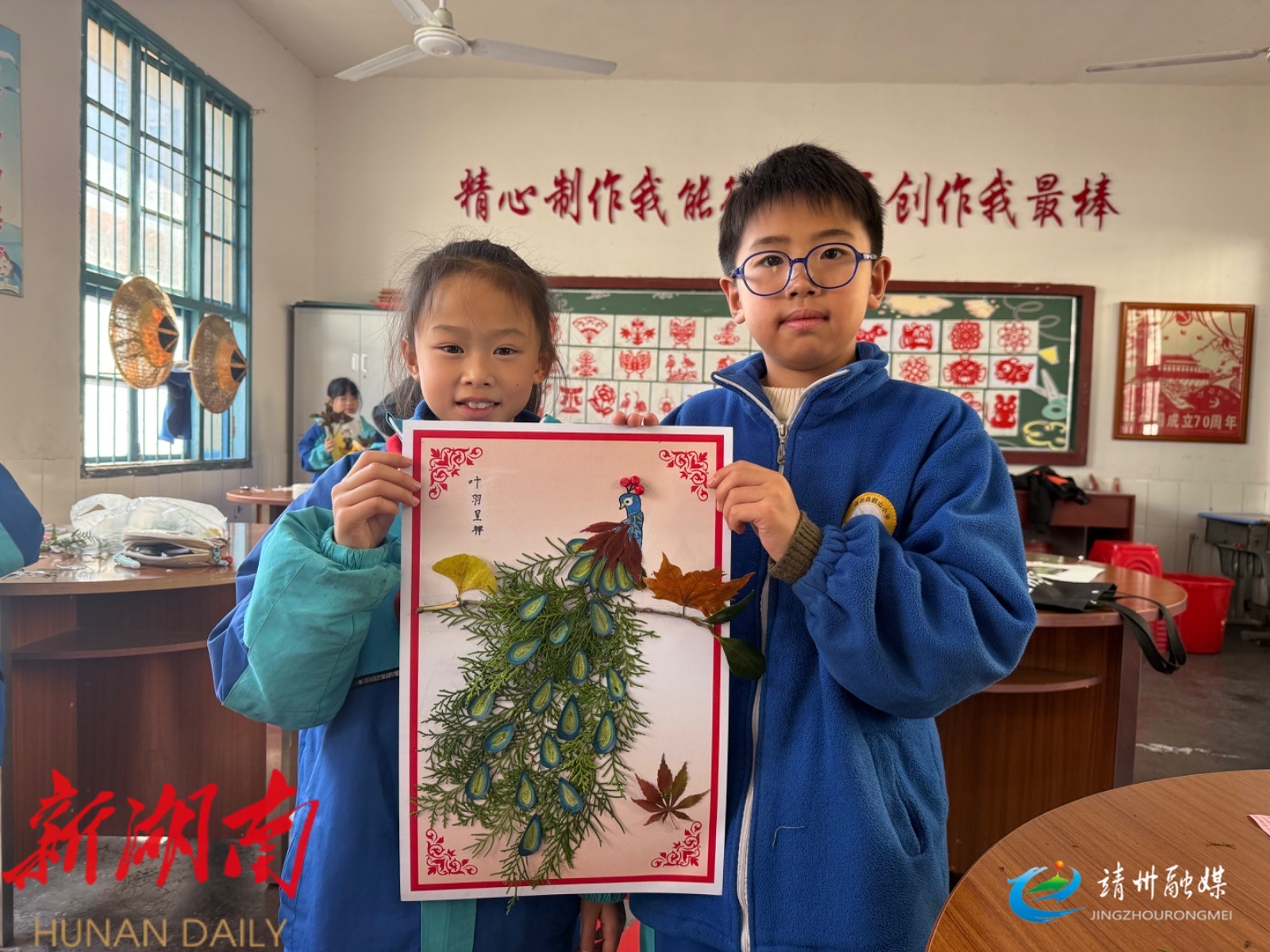 树叶贴画比赛中,学生展示作品《叶羽呈祥》(李兴旭 供图)