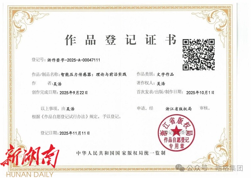 湖南日报·新湖南客户端11月18日讯(通讯员 容轩)近日,皓格集团总裁吴浩博士的学术专著——《智能压力传感器:理论与前沿实践》由自然科学出版社正式出版发行。该著作的出版,不仅是智能传感领域的一项重要学术成果,更标志着集团在前沿技术理论创新与产业实践结合方面迈上了新的台阶。