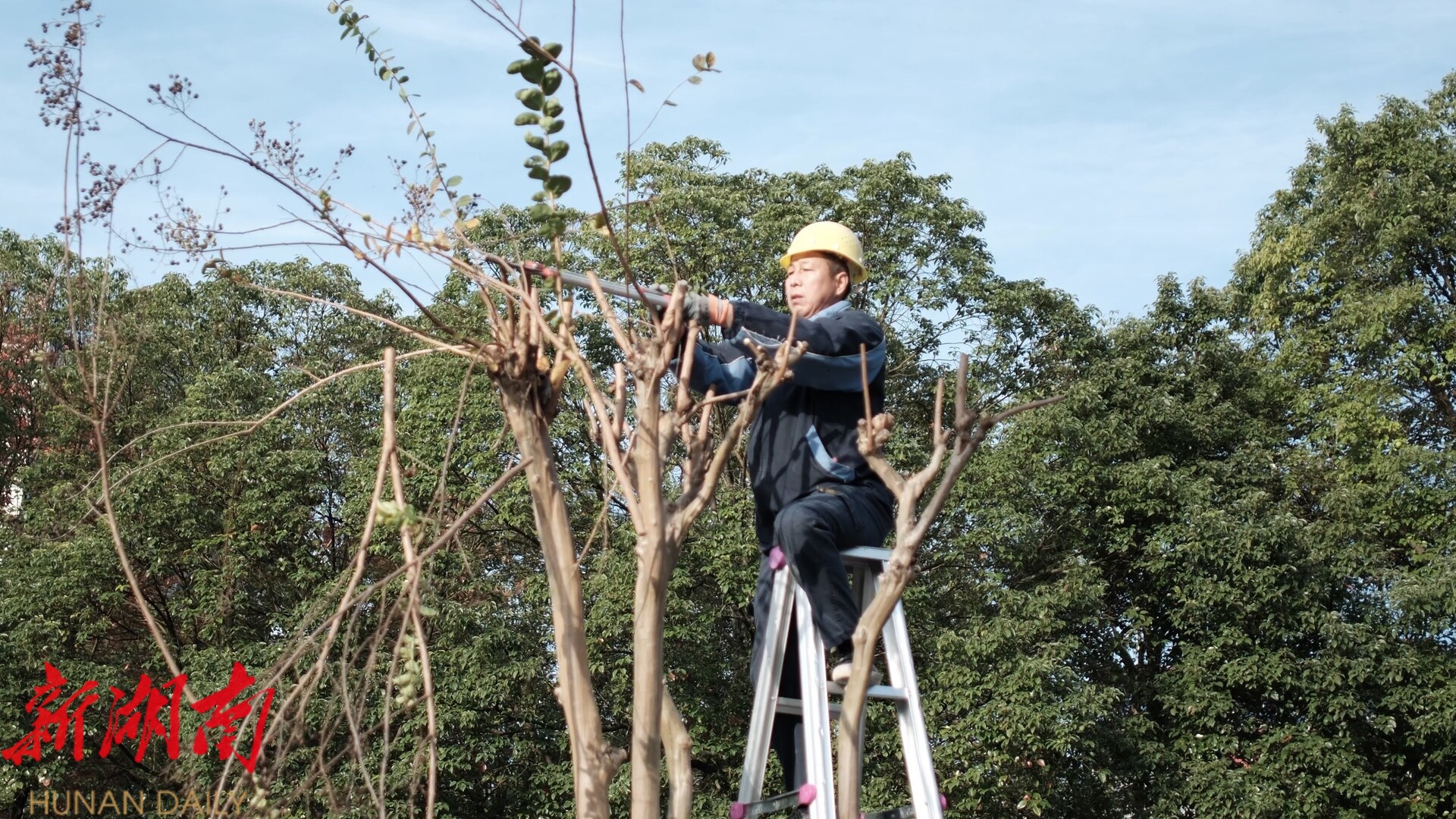11月19日,记者在洞口大道、雪峰中路路段看到,园林工人手持修枝剪、高枝锯等工具,有条不紊地对紫薇树进行精细化修剪。重点剪除病枝、枯枝、交叉枝及过密枝条,为树木积蓄养分、来年形成整齐美观的花势打下基础;在思源学校外路段、三桥路段的三角梅旁,工人们手持工具拆除花圃围栏,另一侧,叉车精准托举带土球的三角梅植株,平稳转运至运输车辆,全程轻抬慢移避免根系受损,确保其适应大棚环境。