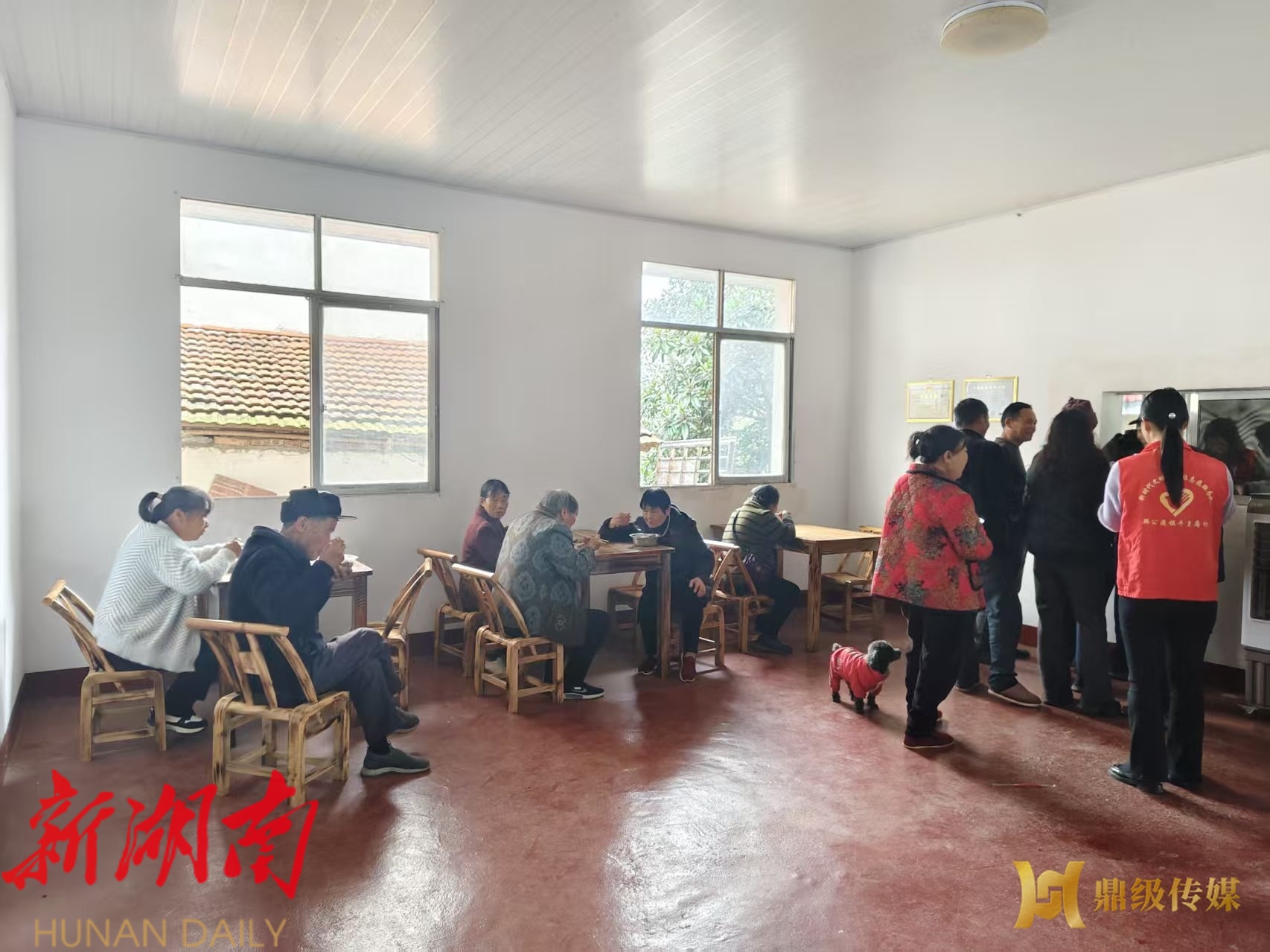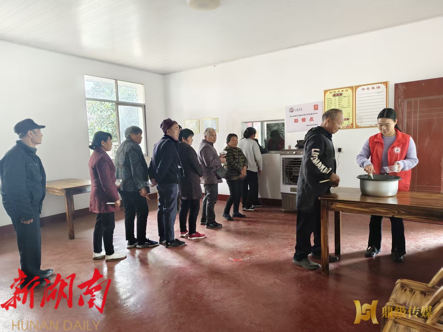 鼎级传媒客户端11月19日讯(通讯员:焦必娟)“开饭咯!今天有红烧肉、清炒时蔬,还有暖胃的冬瓜汤!”11月18日中午12点,伴随着志愿者热情的招呼,韩公渡镇牛皇庵村老年人助餐点正式开餐,20余名留守、独居老人排队打好饭菜后围坐在一起,捧着热气腾腾的饭菜,脸上满是幸福的笑容。